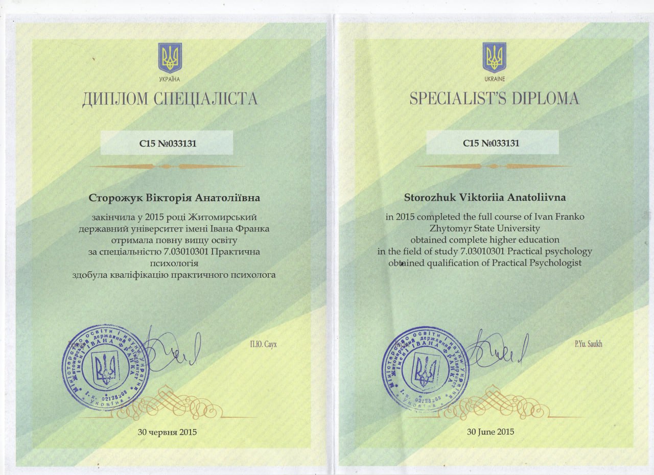 Я практикуючий психолог в інтегративному підході, член Національної психологічної асоціації. Моя робота базується в психоаналітичному напрямку, з додатковим використанням різних методів, що дозволяє розглянути проблему з різних боків та дати ефективніший результат. Як фахівець, я постійно вдосконалюю свої навички, безперервно навчаюсь і регулярно відвідую супервізії та інтервізії. Запити з якими я працюю: Самооцінка та самоцінність, Міжособистісні стосунки, Розлучення, сімейні кризи, Дитячо-батьківські відносини, Сепарація та особисті кордони, Переїзд та адаптація, Панічні атаки, тривожність, Проблеми харчової поведінки, Психосоматичні захворювання, Пошук сенсу життя, вікові кризи, Реалізація у кар'єрі, Відносини з грошима, *перелік запитів не є вичерпним.