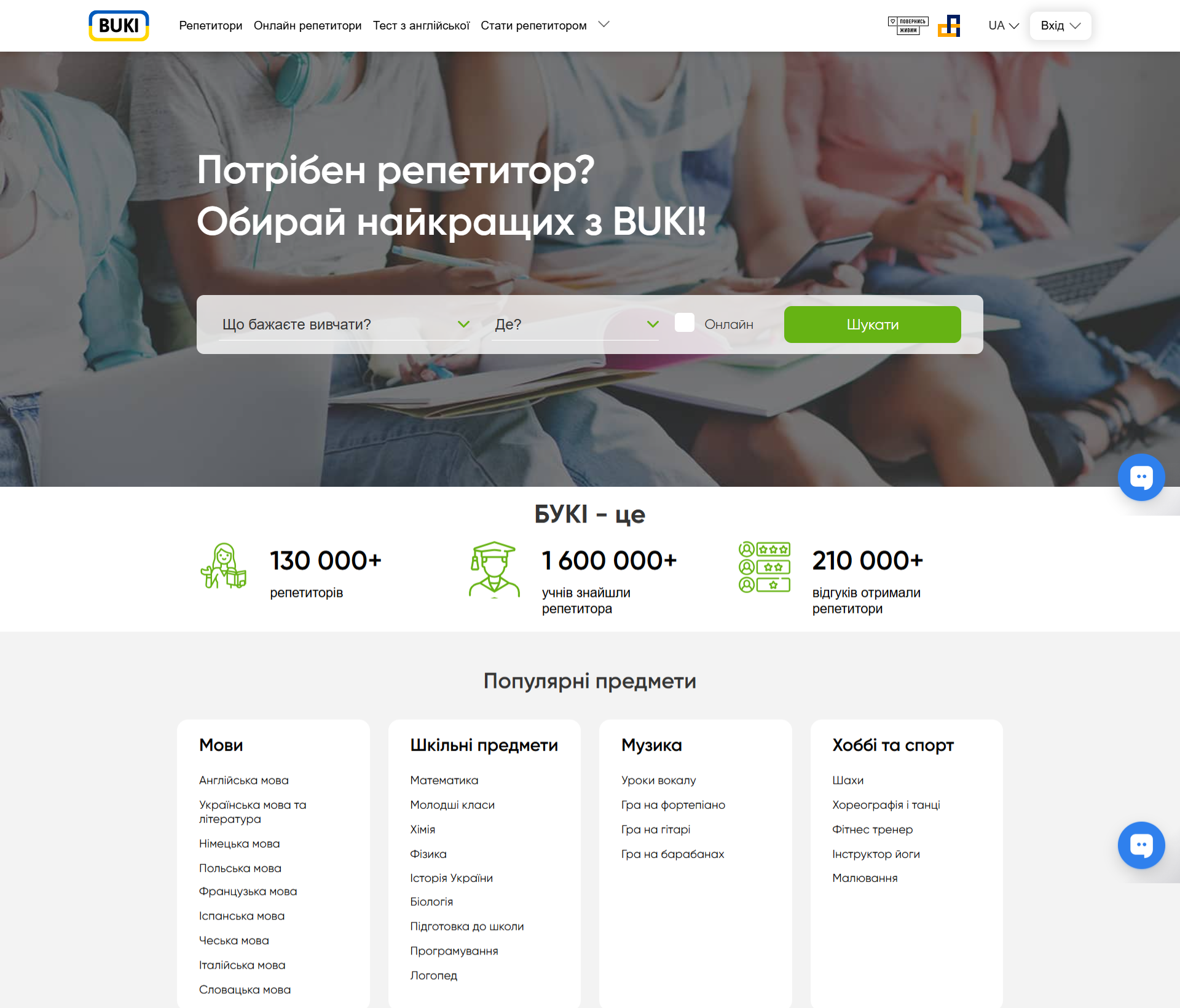 BUKI — международный сервис по поиску и выбору репетиторов для индивидуальных занятий. На платформе зарегистрировано почти 1900 преподавателей немецкого языка. Есть четкая система фильтров, которая позволяет быстро выбрать педагога по таким критериям: онлайн или офлайн (город/район), только проверенные репетиторы, уровень подготовки, цена, рейтинг преподавателя.