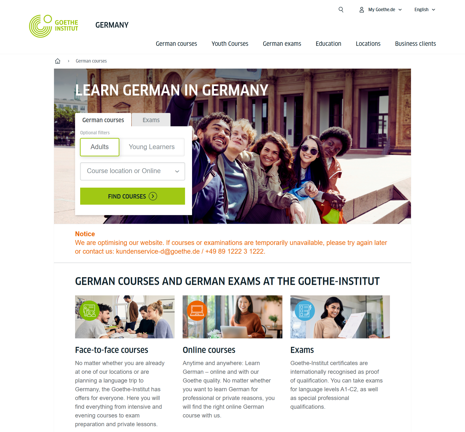 Украинский сайт goethe.de является одним из 150 представительств культурно-образовательных немецких центров в 99 странах мира. В Украине платформа работает уже 30 лет. Здесь можно зарегистрироваться на сдачу экзамена Goethe-Zertifikat для уровней A1–C2 (для подростков и взрослых), экзамена TestDaF (для высшего образования) и Goethe-Test Pro (для профессии).