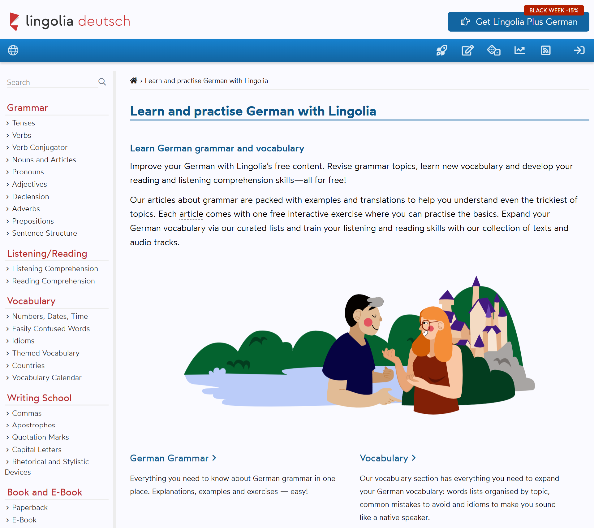 Сайт deutsch.lingolia.com доступен на английском языке; здесь можно изучать несколько языков, включая немецкий. Рейтинг сервиса на Trustpilot — 4,7 из 5. Учебные ресурсы сайта — грамматические темы, лексический набор, задания на чтение и аудирование — частично бесплатные и частично платные. Стоимость платной версии начинается от €10,20 за 3 месяца.