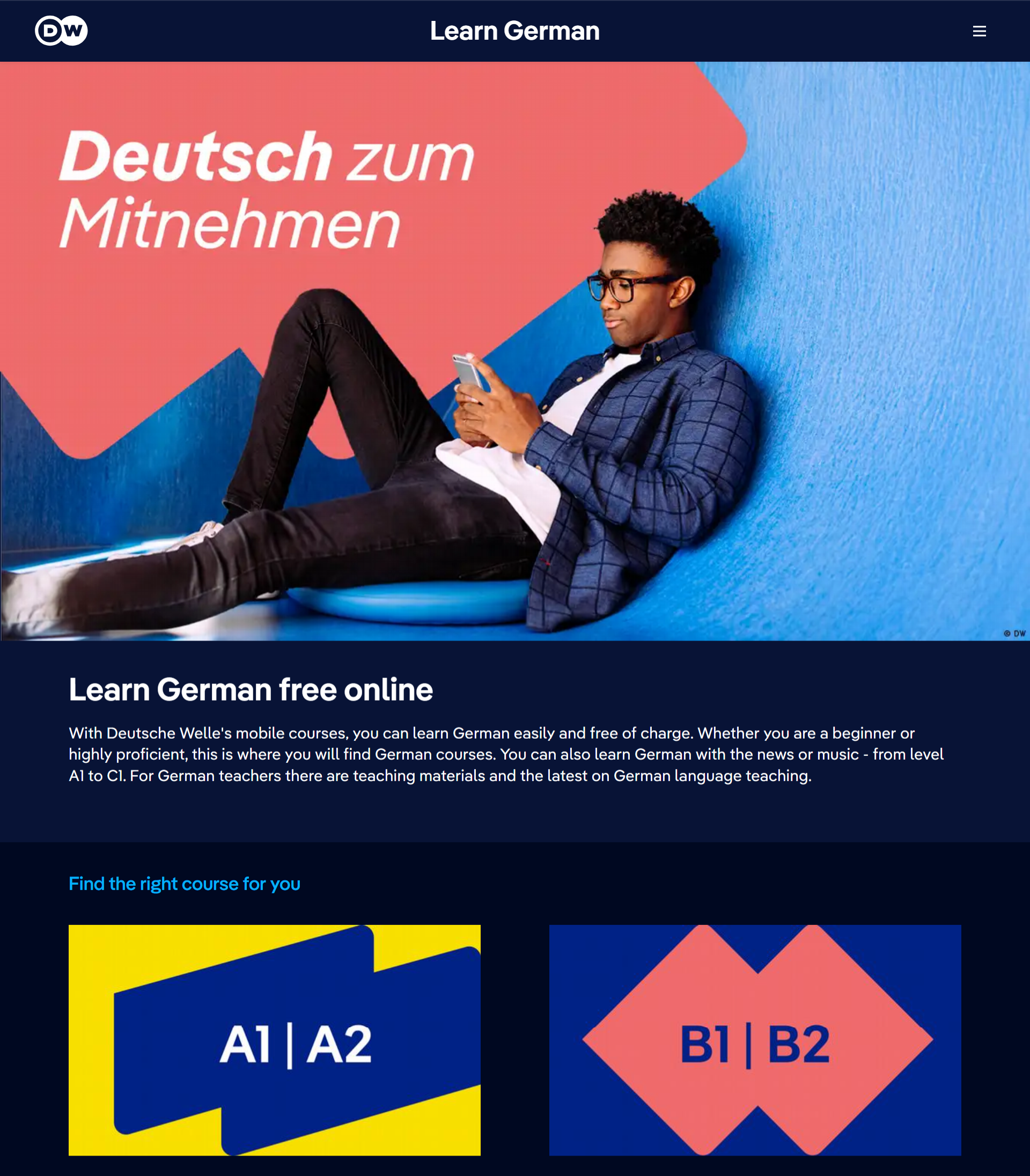 Платформа Learn German — проект международного языкового медиаконцерна из Германии и предлагает бесплатные ресурсы для изучения немецкого языка. У сайта есть мобильное приложение (для Android + iOS), которое интегрирует учебные материалы DW. Поддержка многих языков (в том числе украинского) на начальных этапах — хороший подход для новичков, которые еще не знают английского или немецкого.