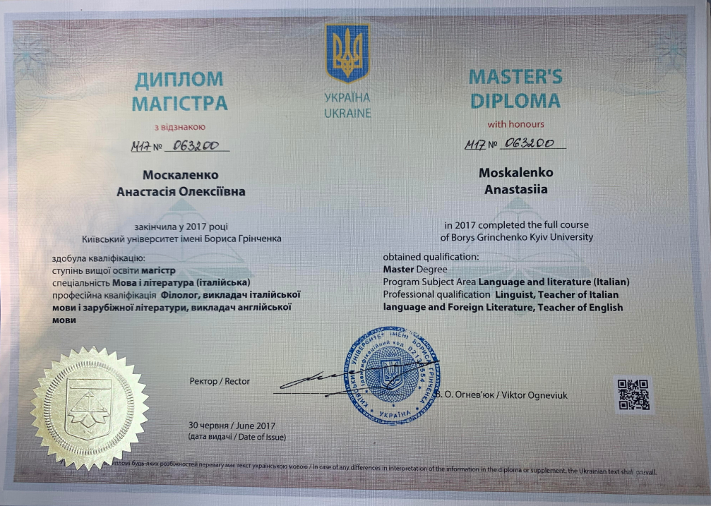 Преподаватель английского и итальянского языков! Учу том, что нужно именно Вам (работа со студентами всех уровней beginner - advanced, повышение успеваемости в школе, подготовка к ВНО, разговорная речь). Образование - КубГУ, Università di Foggia, Università Dante Alighieri (Italia). Опыт работы - более 5 лет; Работаю преподавателем в Киевском университете имени Бориса Гринченко.