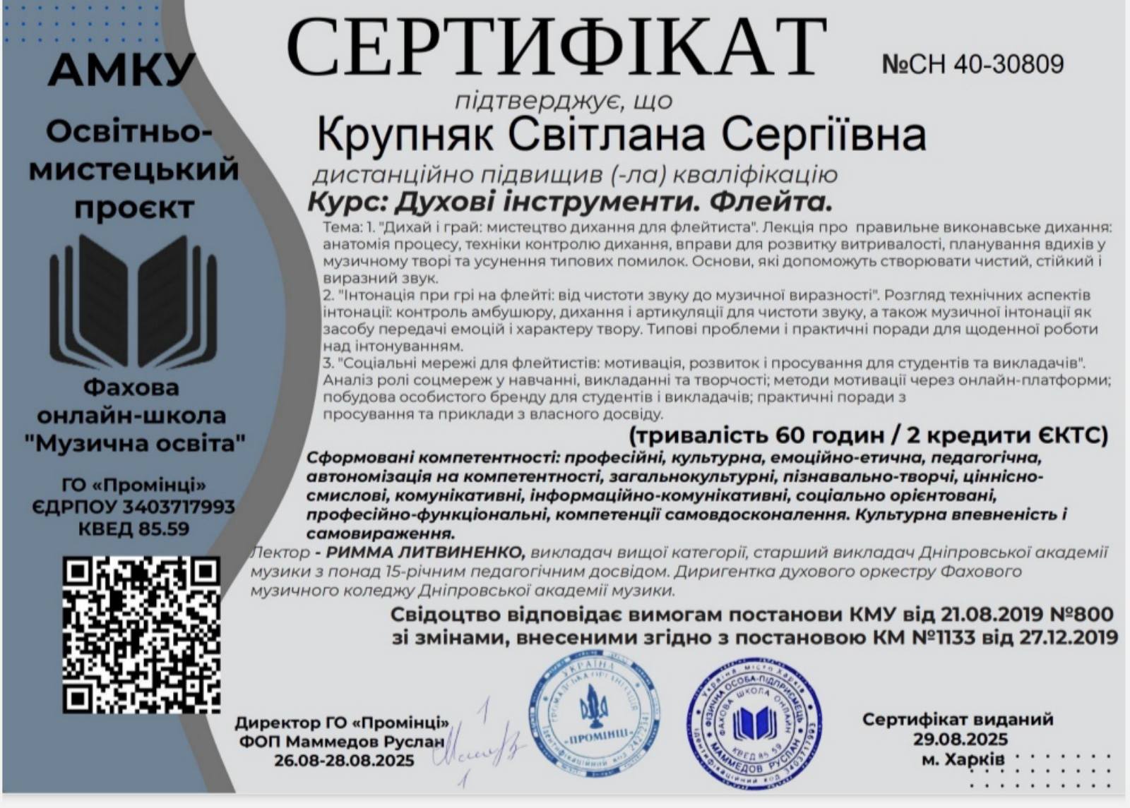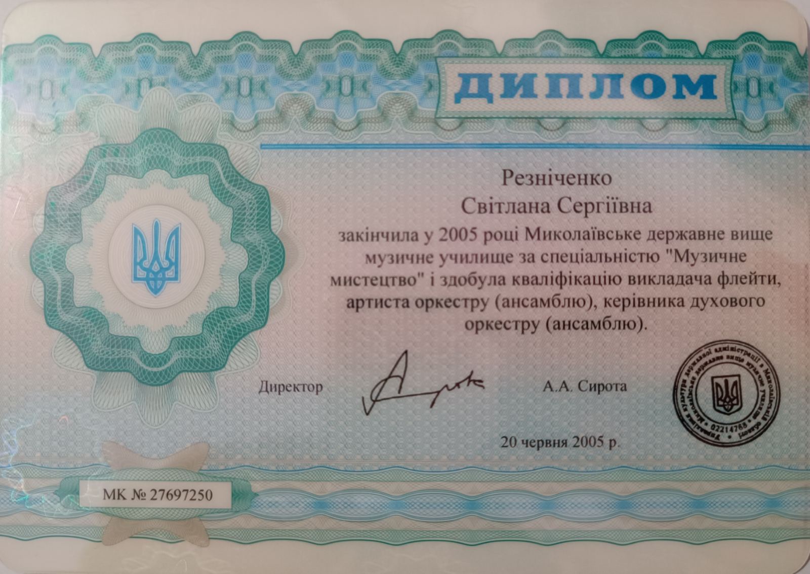• Николаевское высшее государственное музыкальное училище - класс флейты (2005)