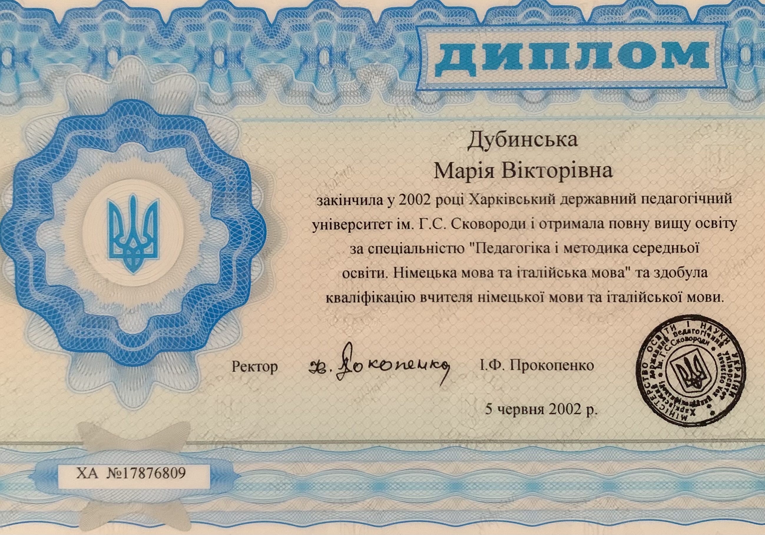 закончила харьковский национальный педагогический университет, начала преподавать еще во время учебы в университете, после окончания работаю как преподаватель и переводчик итальянского языка