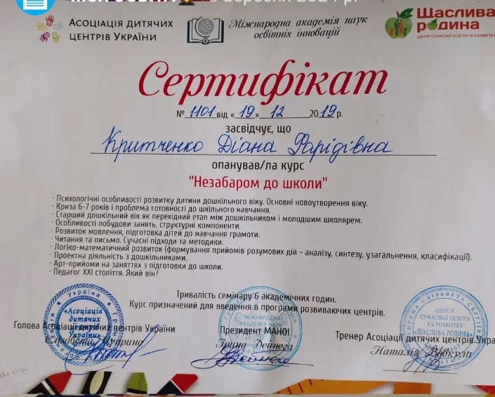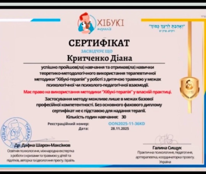 Есть педагогическое и психологическое образование, работаю с детьми дошкольного и младшего школьного возраста. Помогаю детям овладевать украинским языком, чтением и базовыми учебными навыками в безопасной, поддерживающей атмосфере.