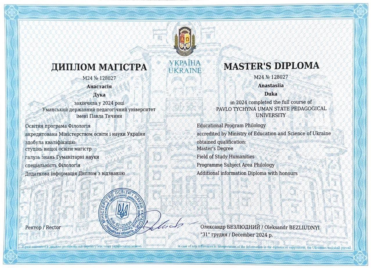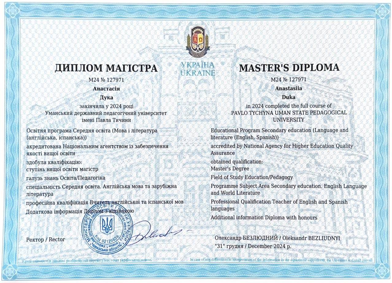 Привет! Добро пожаловать на мой профиль. Я - репетитор по английскому языку с 5-летним опытом работы и высшим профессиональным образованием: имею степень бакалавра и магистра, полученные на факультете иностранных языков университета. На занятиях - поддержка, логика, практика и адаптация под твои цели: обучение, работа или путешествия.