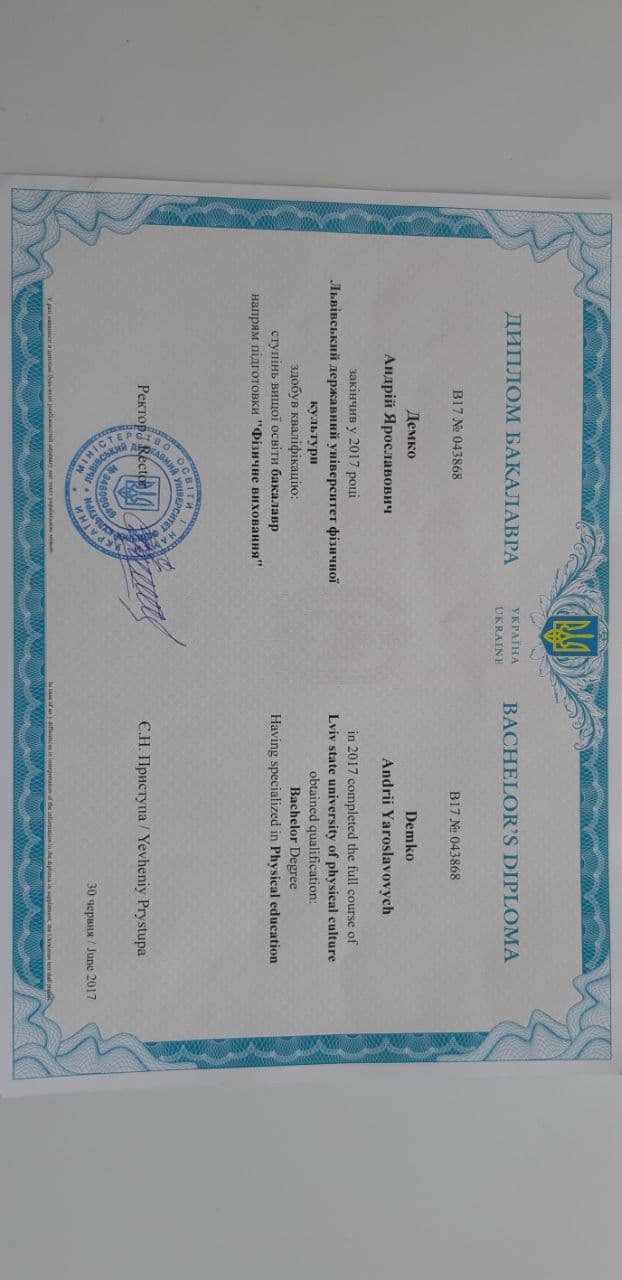 У меня профильная университетское образование. Окончил Львовский государственный университет физической культуры и спорта.