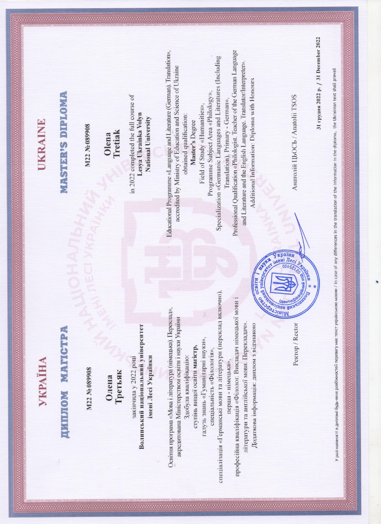 Окончила факультет иностранной филологии в Волынском национальном университете им. Леси Украинки. Имею статус магистра германской филологии. Готовлю уроки, учитывая способности и особенности каждого отдельного учащегося и ученицы. Веду уроки на украинском языке, но если ученик/ученица достаточно владеет немецким языком – для общения с учеником/ученицей использую немецкий язык.
