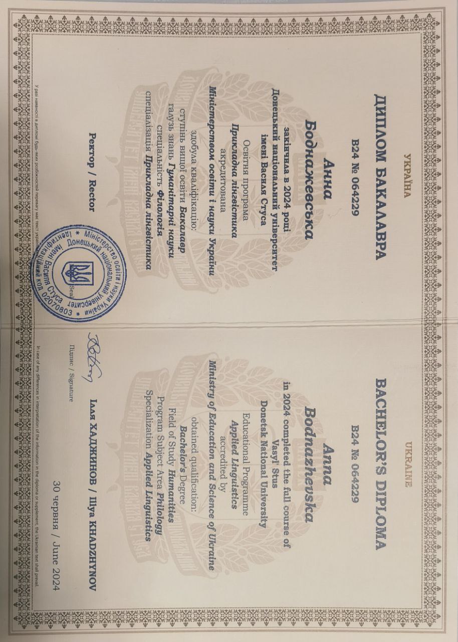 2020 – 2024 Донецкий национальный университет имени Василия Стуса (Винница, Украина)