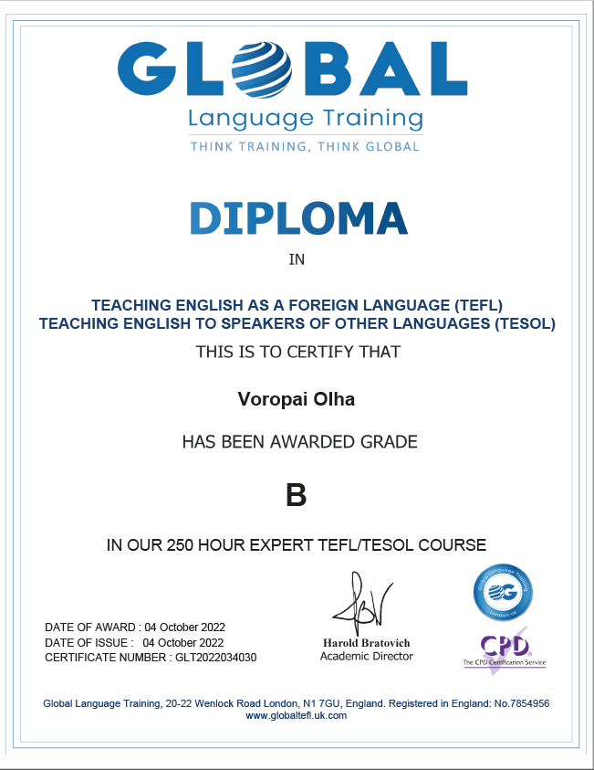 - имею высшее филологическое образование - имею TESOL сертификат, подтверждающий мою квалификацию - опыт работы более 8 лет - индивидуальный подход - работаю только онлайн - использую аутентичные материалы