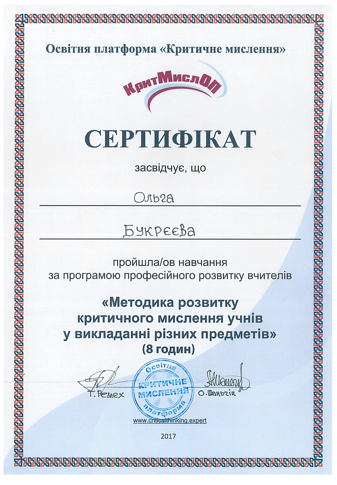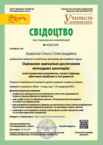 Дипломированный учитель начальных классов. Сертифицированный тренер НУШ. Проходила подготовку в Новопечерской школе (г. Киев). Работаю в школе.