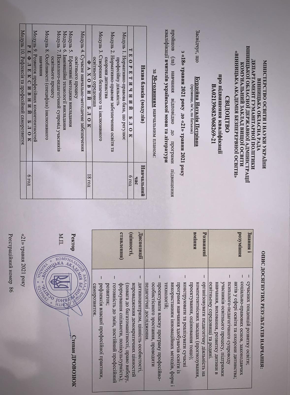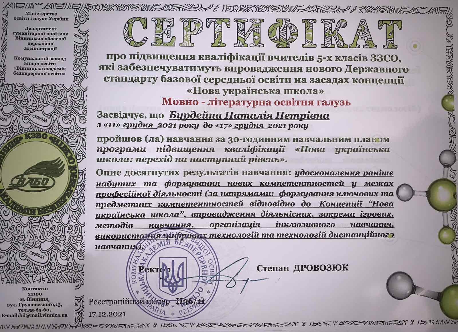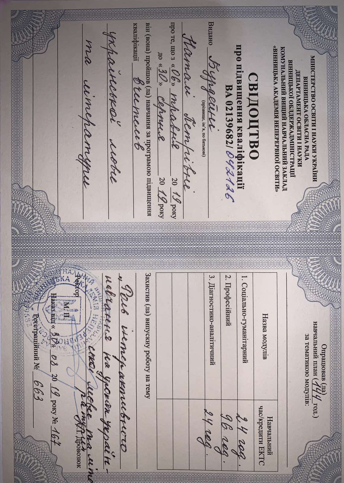 У моих учеников высокие баллы на ВНО, занимают призовые места на олимпиадах и языковых конкурсах. Есть публикации по теории и методике литературы, языка в профессиональных изданиях, дипломант конкурса «Панорама творческих уроков», "Учитель года". Прошла курсы Intel, готовлю презентации к урокам, тесты, практику работы в системе «1+1» (1 ученик+1 компьютер). Нахожу личный подход к каждому ученику.