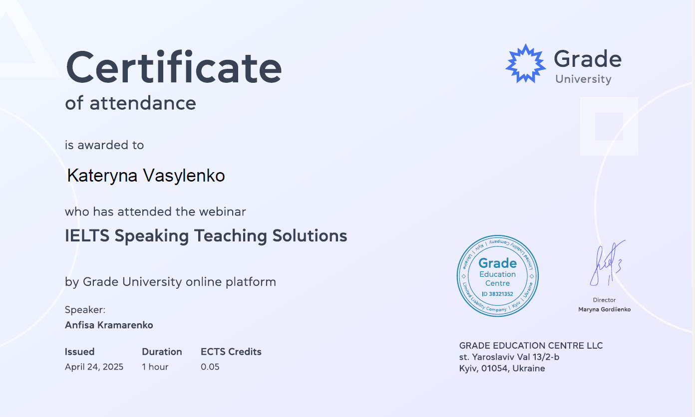 - Сертификат о прохождении тренинга-семинара в учебном центре для преподавателей Grade Education Centre
