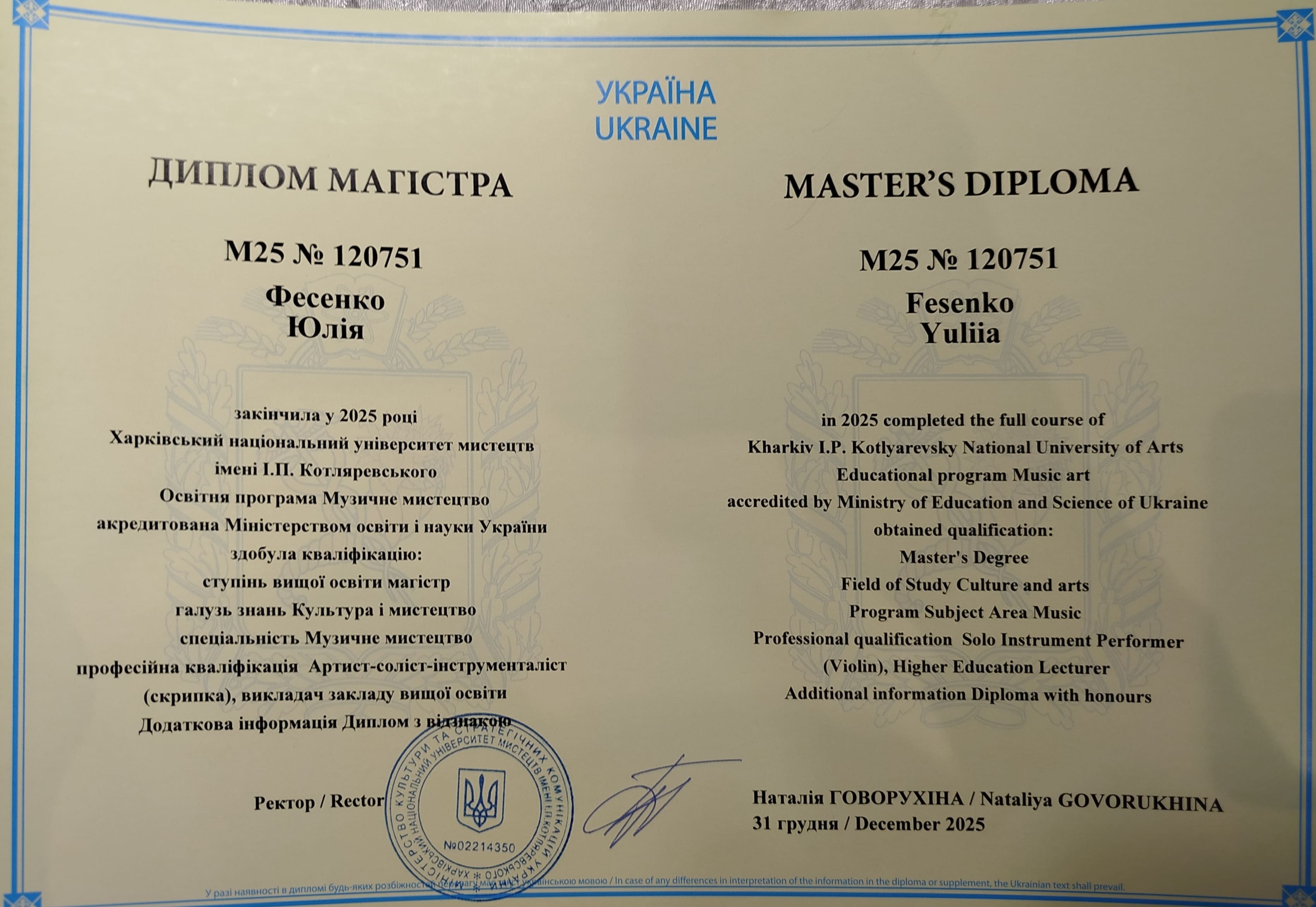 Окончила с отличием Харьковское музыкальное училище им. Лятошинский и Харьковский Национальный Университет Искусств им. Котляревского (бакалавр) (как преподаватель скрипки); сейчас учусь в магистратуре ХНУМ.