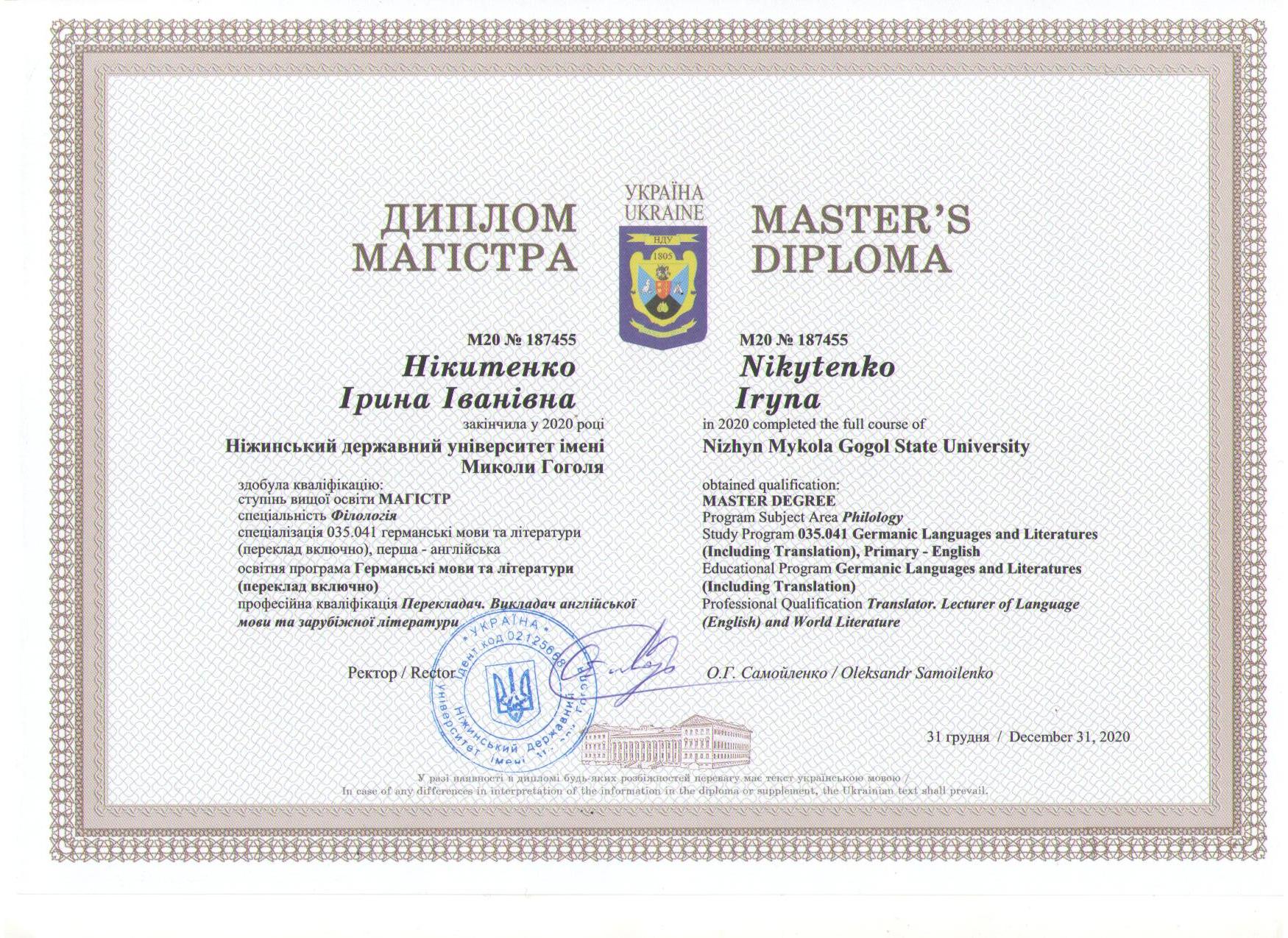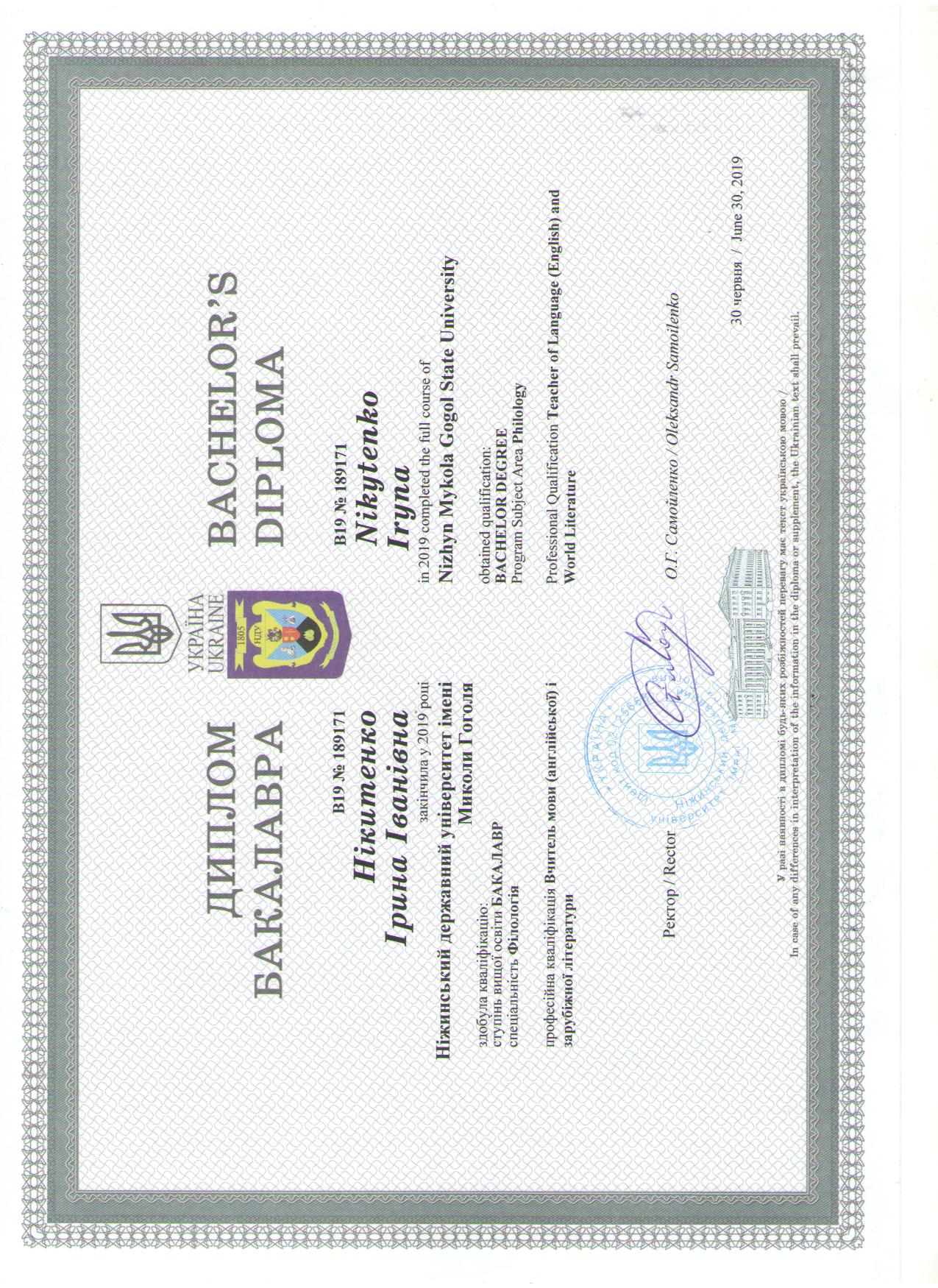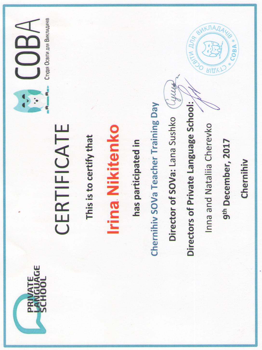 Конечно, у меня есть диплом преподавателя и куча сертификатов от Cambridge University, Oxford University, TESOL Academy и British Council. Я участник проекта "Учитель нового поколения" и именно это помогло мне создать собственный стиль преподавания. Считаю, что мой лучший сертификат - результаты моих студентов, сдающих экзамены, переезжают за границу или начинают говорить после многих лет бессодержательного зубренья.