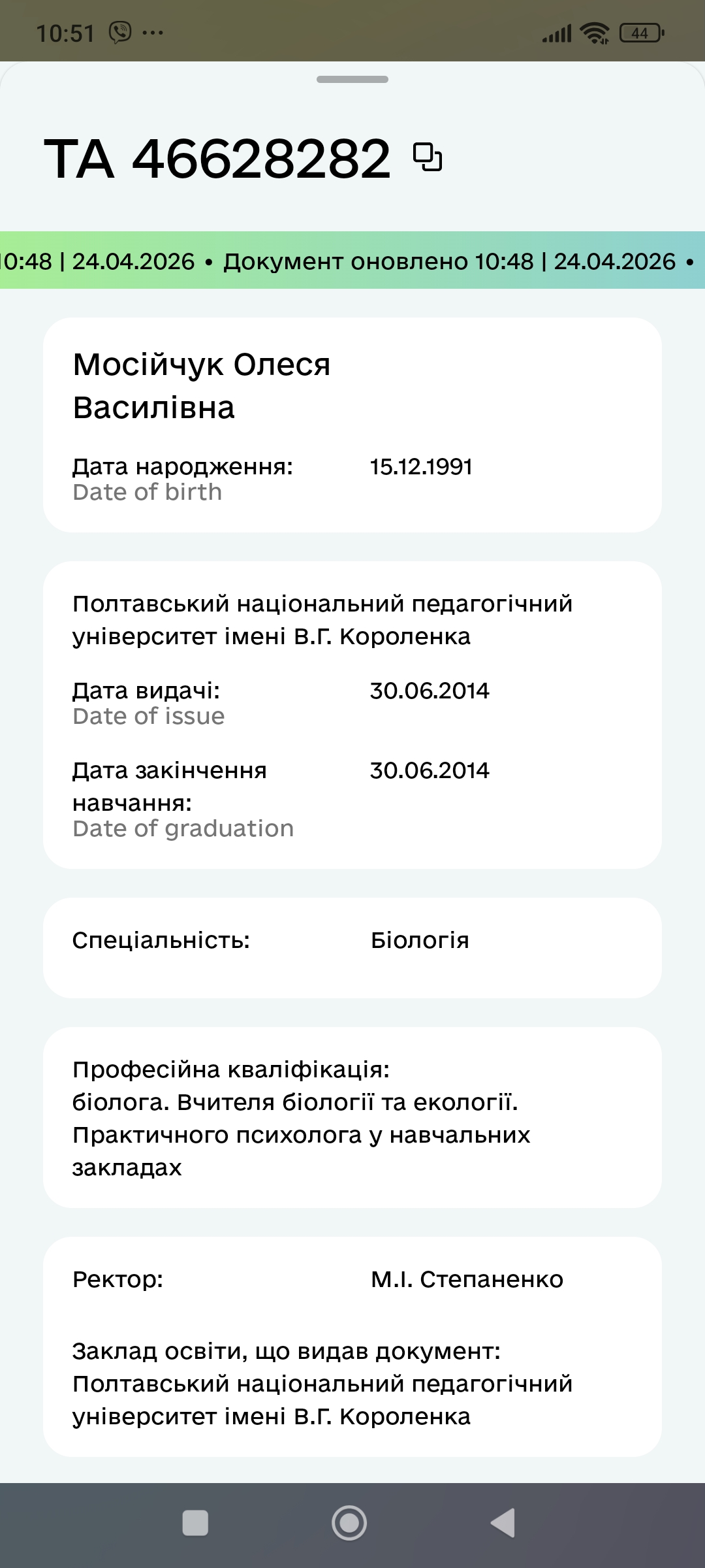 Мне 31 год, имею семью, троих детей, обучаю их, помогаю с домашними заданиями. Училась в ПНПУ им. В. Г. Короленко, люблю учить детей новому и интересному.