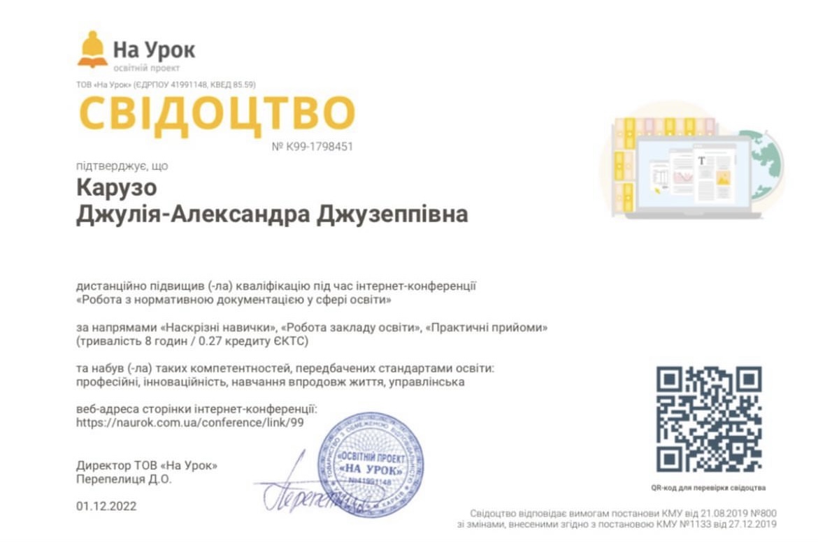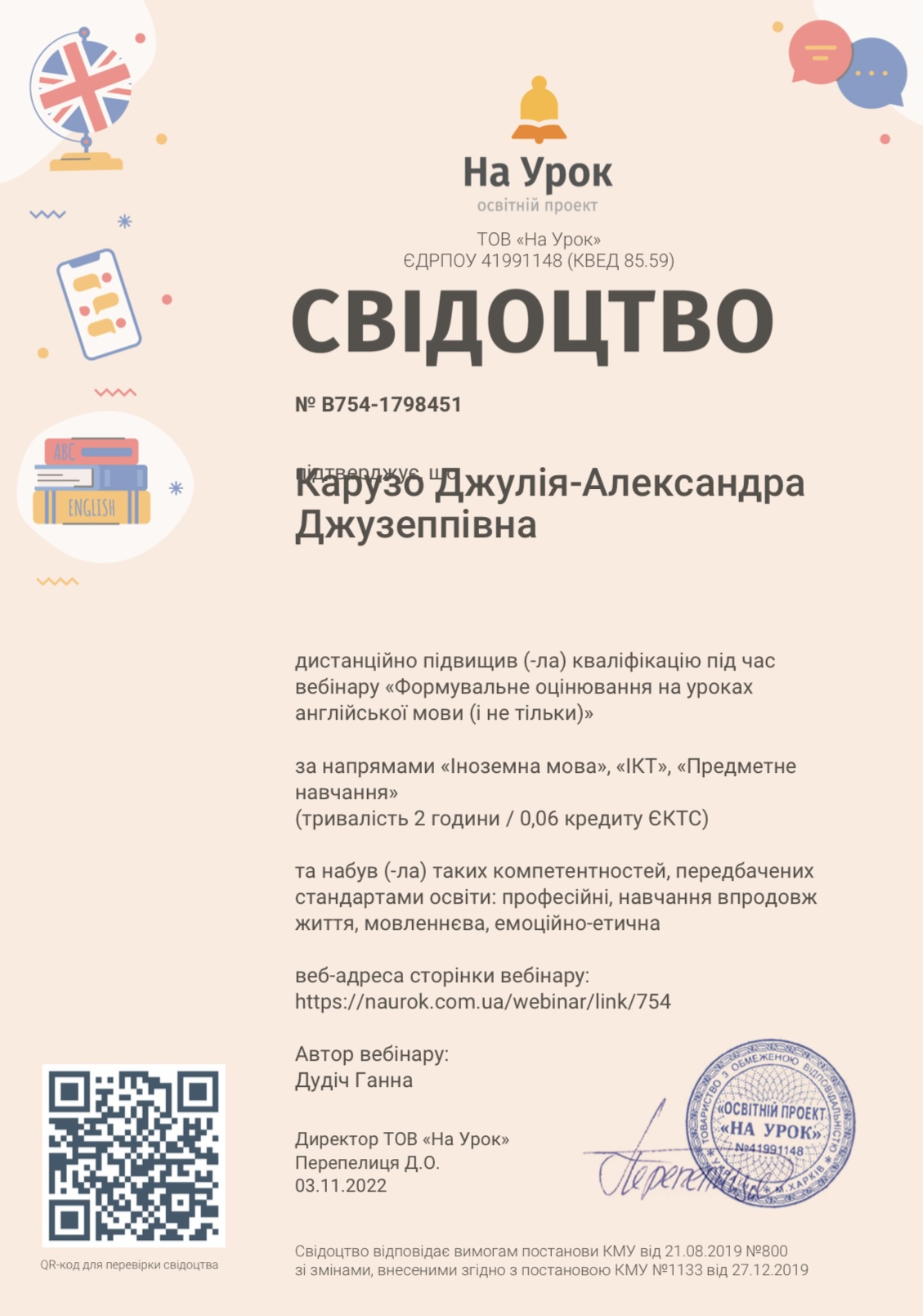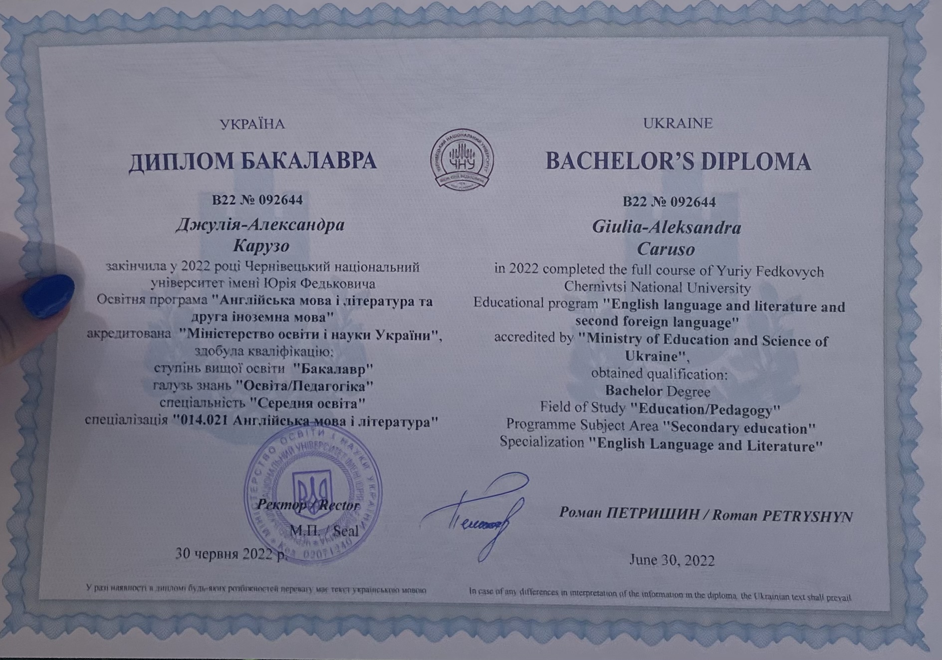Получила диплом бакалавра в 2022 году, в ЧНУ, факультет иностранных языков (направление среднее образование). Кроме того, сейчас учусь на магистратуре и прохожу много курсов для повышения своей профессиональной квалификации.