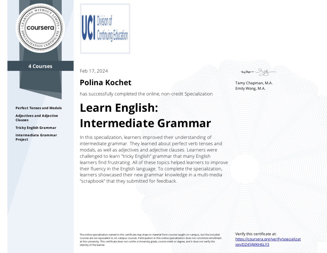 -успешно прошла международные курсы для грамматики высокого уровня;