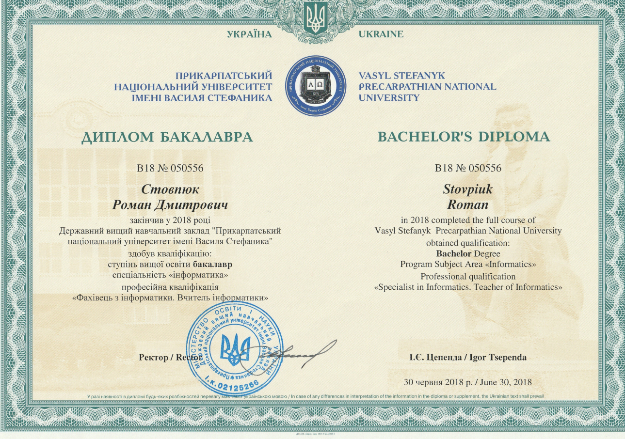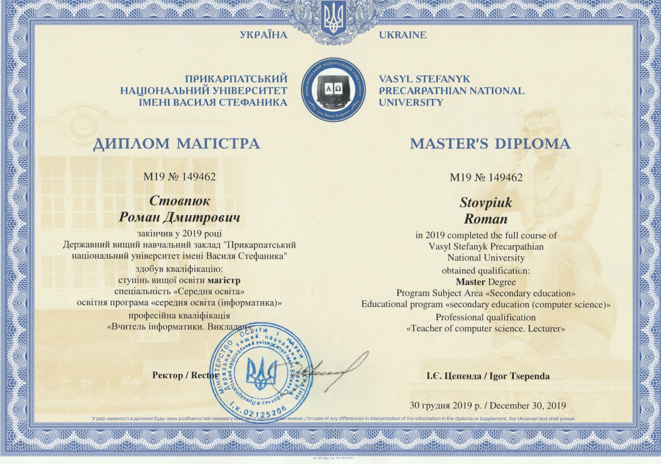 Окончил в 2019 году Национальный Прикарпатский Университет имени Василия Стефаника, специальность "Среднее образование (Информатика)", магистр.