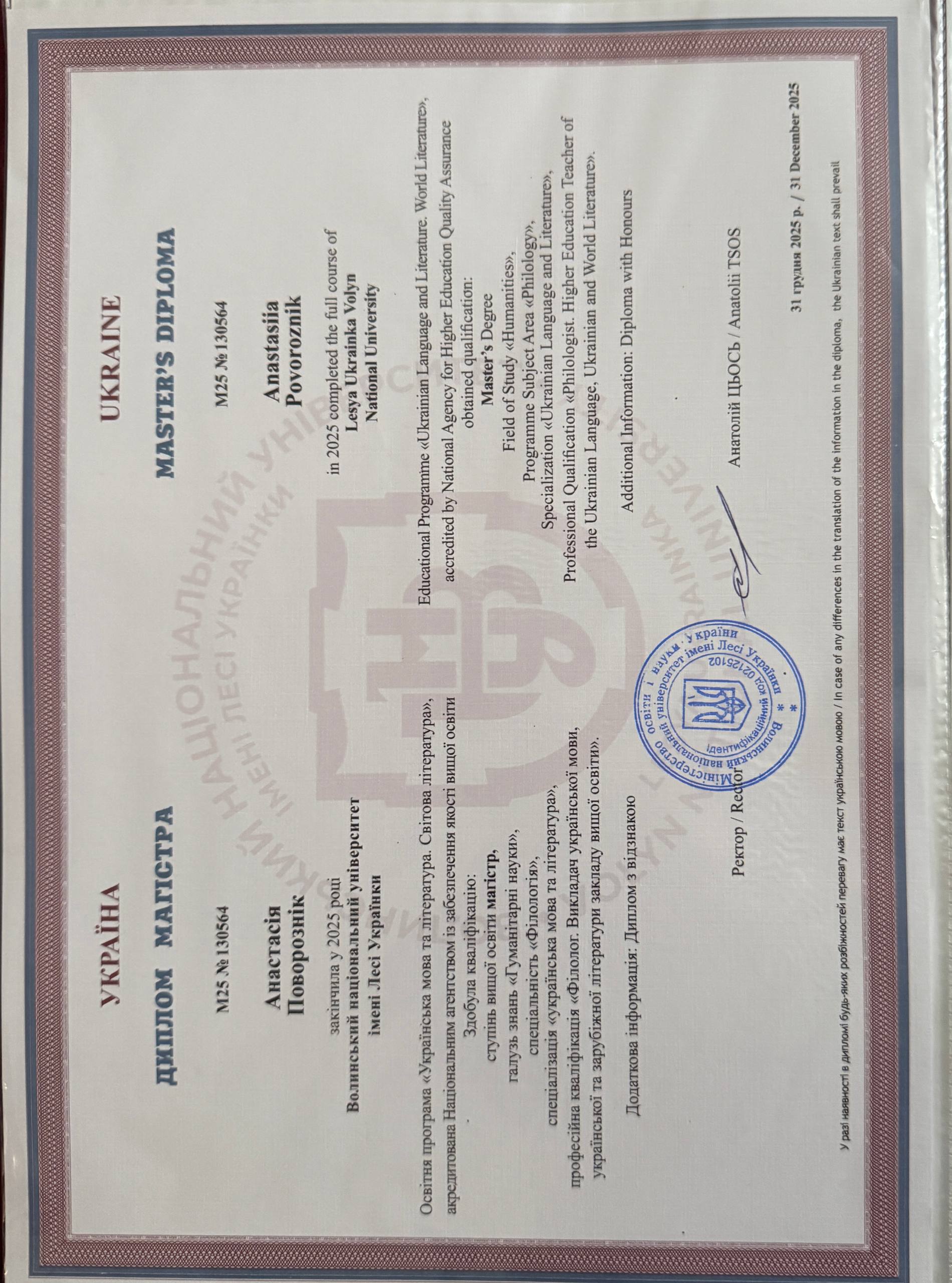 Я дипломированный учитель украинского и английского языков, выпускница Волынского национального университета имени Леси Украинки. Сейчас продолжаю профессиональное развитие. Свободно владею обоими языками и эффективно обучаю как украинскому, так и английскому.