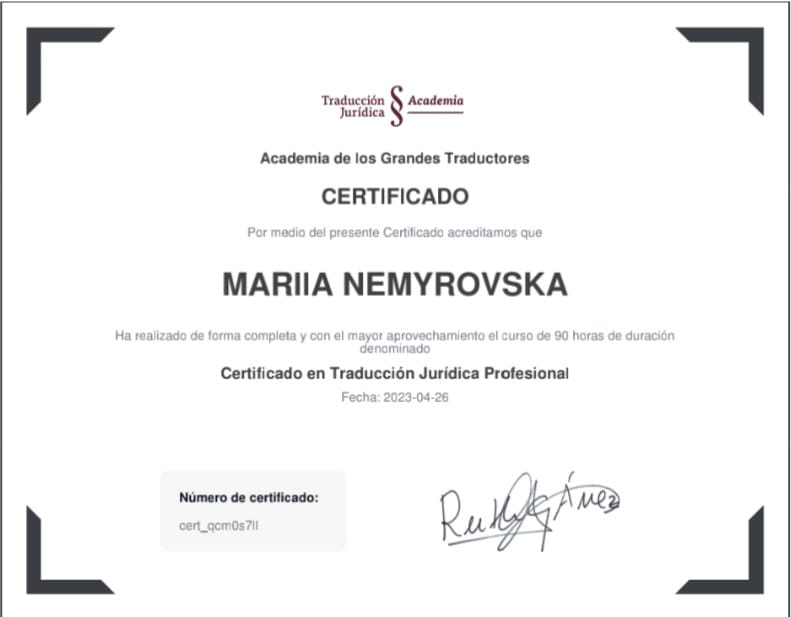 Имею диплом Universidad Nebrija, Мадрид по испанскому языку и праву.