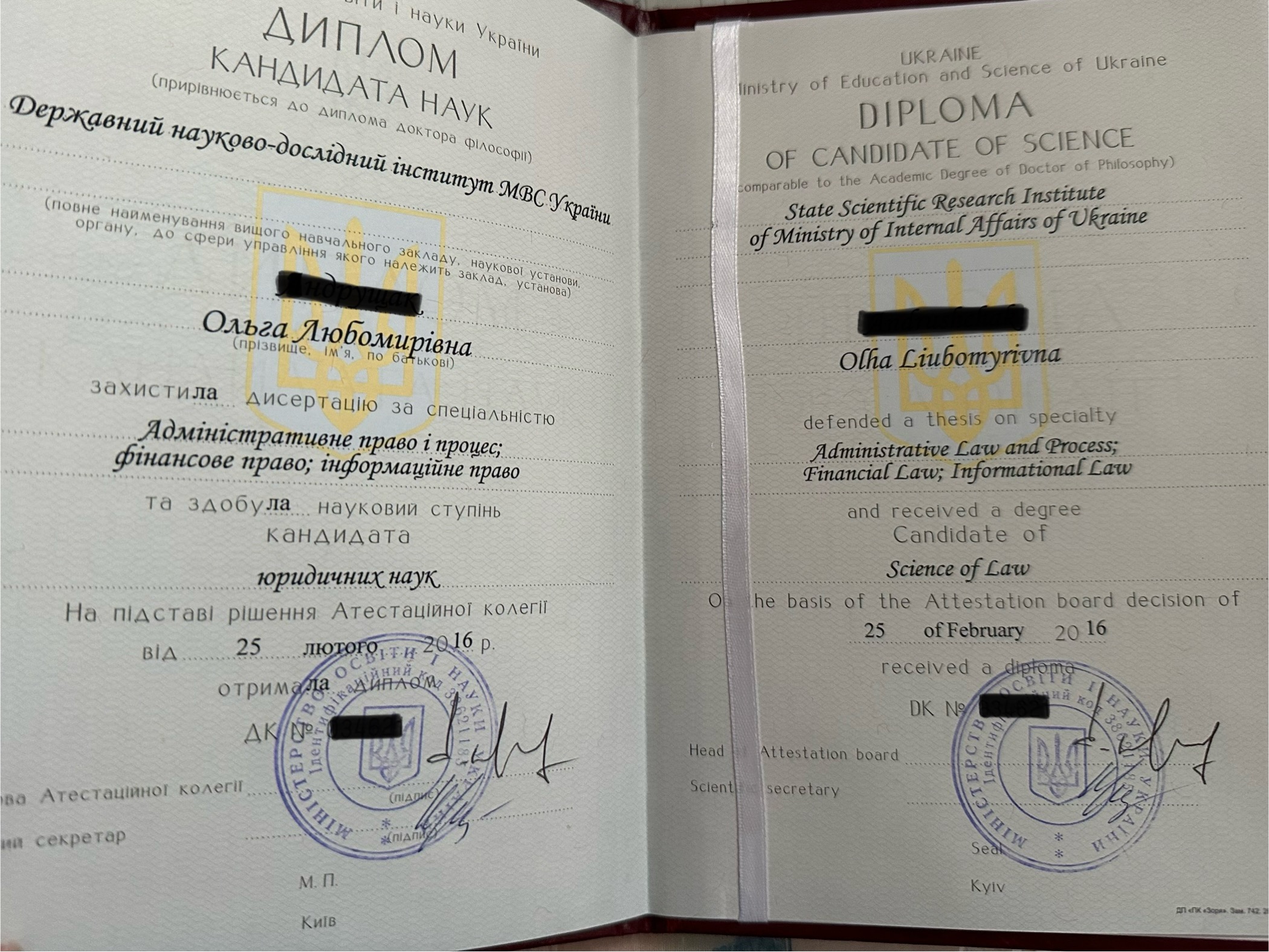 В своем арсенале достижений имею диплом магистра права с отличием, диплом кандидата юридических наук.