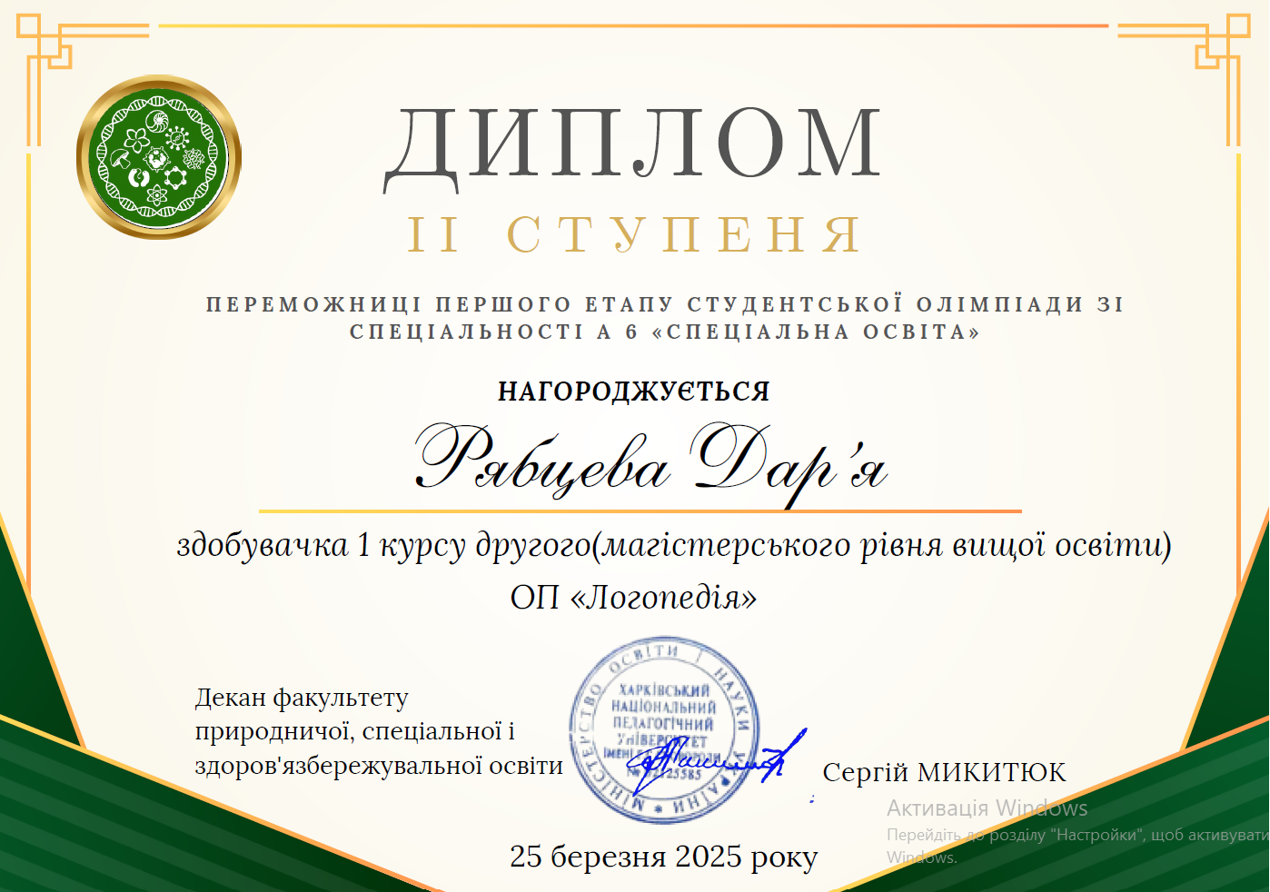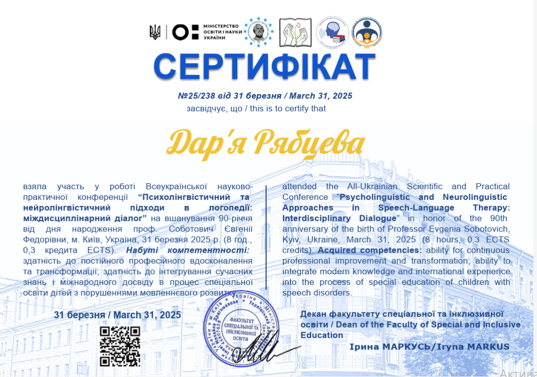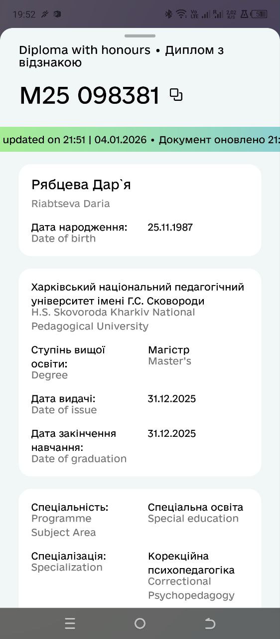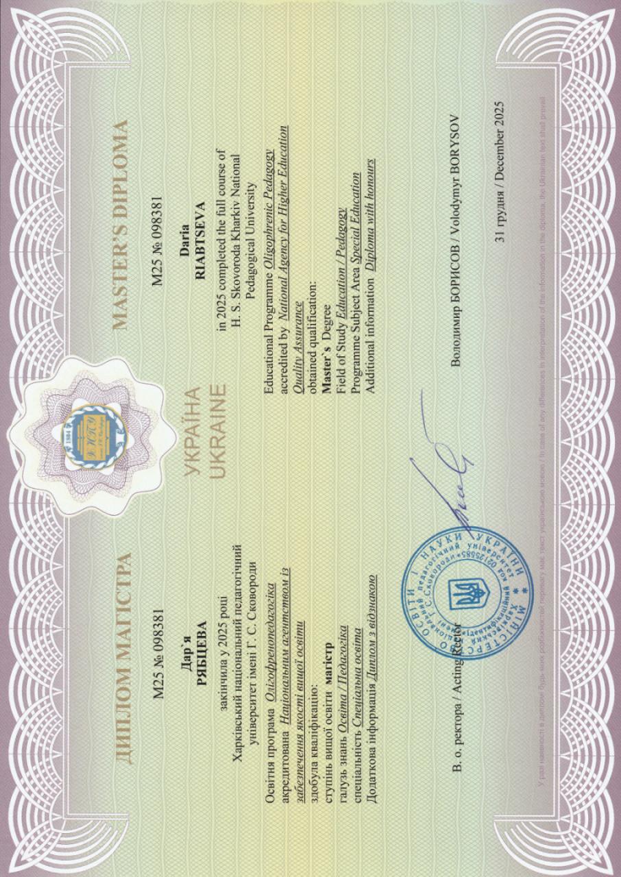 Два высших образования – логопеда и коррекционного психопедагога (дефектолога).