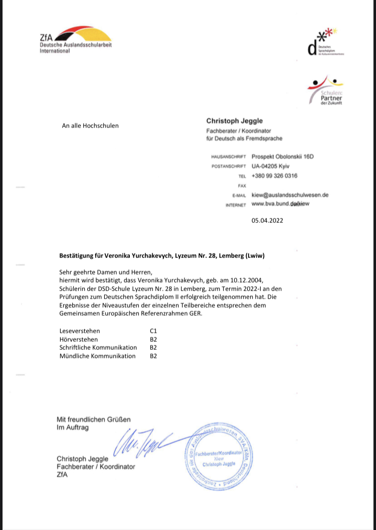 Имею диплом ДСД (немецкий языковой диплом, включающий аудирование, чтение, говорение, письмо) уровня B2 и C1. Имею универсальные методики, которые подходят для каждого, кто хочет учиться и работать для изучения языка.