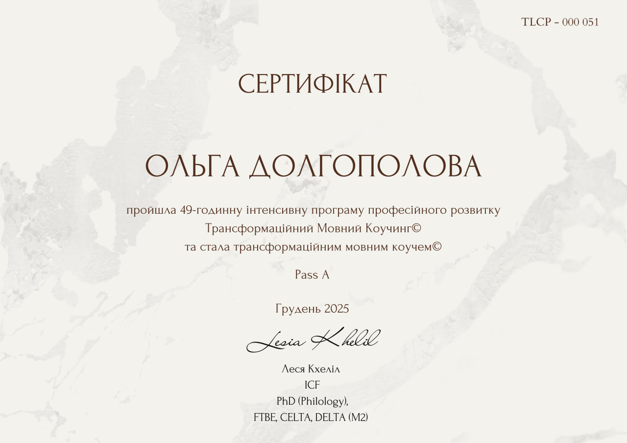 Я магистр перевода и филологии, с более чем 10-летним опытом преподавания и десятками успешных историй студентов, которые достигли своих целей (от первых шагов до международных интервью). Как языковой коуч я не только обучаю, но и помогаю работать с целями. Я сочетаю коучинговые инструменты с преподаванием, создавая безопасное и поддерживающее пространство, где ученик чувствует: "Я могу!". Вместе мы формулируем и уточняем цель, я объясняю материал максимально доступно и в нужном контексте, и показываю, как эти знания можно применять в реальных ситуациях.
