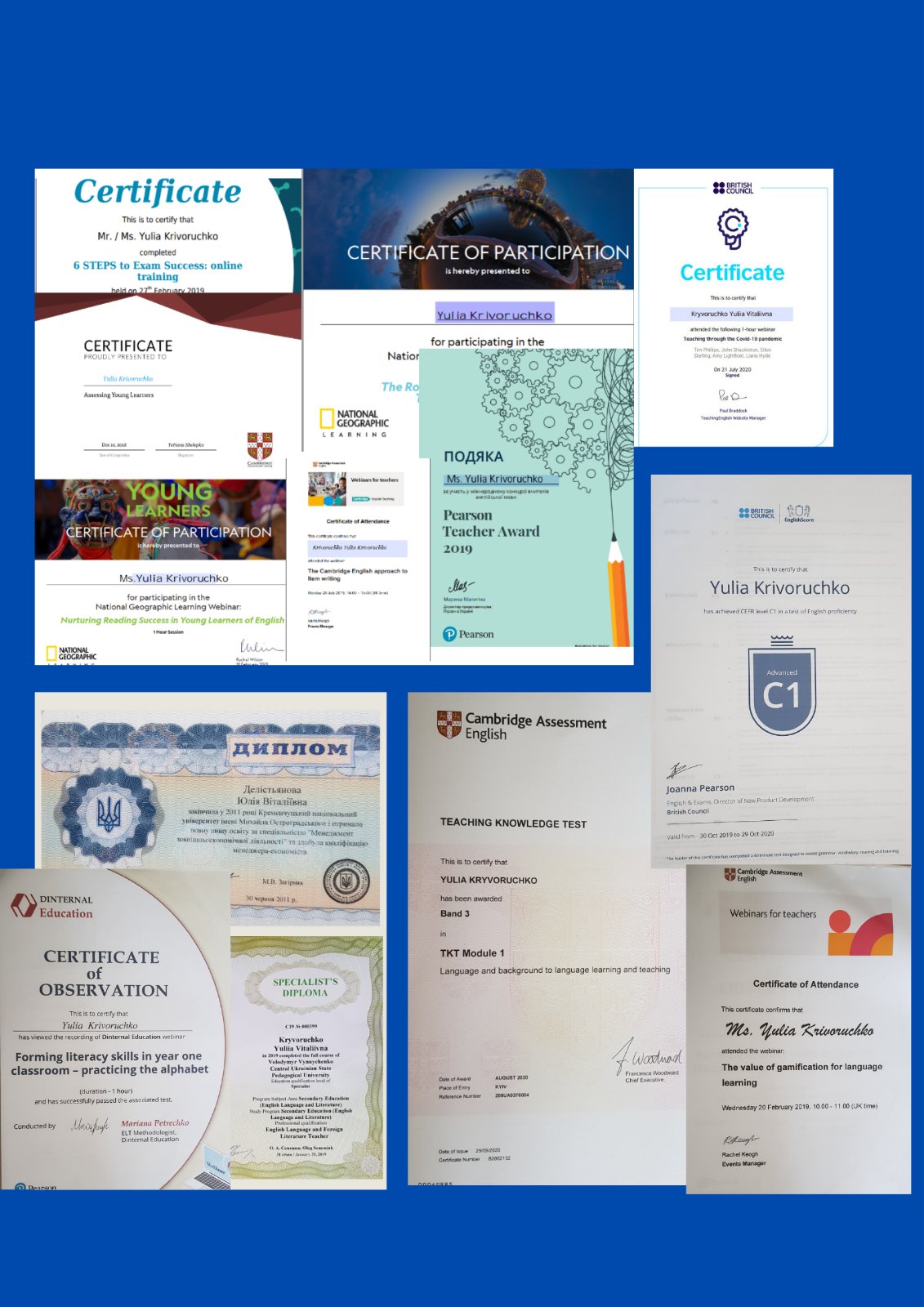 - Курс по соблюдению HIPPA для удаленных переводчиков (выдано Proz.com 10.08.2023, 06.03.2025);