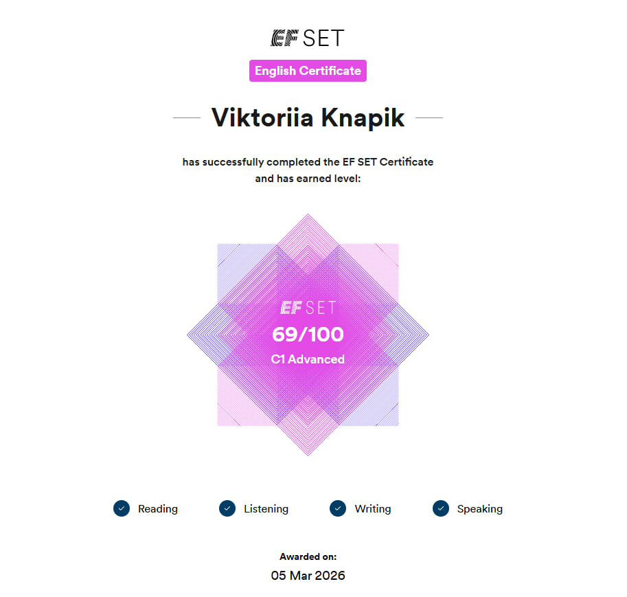 Студентка Национального университета «Киево-Могилянская академия» и учусь на бюджете по специальности английская филология. Умею поощрить, держать внимание и учу в интерактивной форме. Имела опыт преподавания английского языка для детей 4, 5, 6, 7 классов.