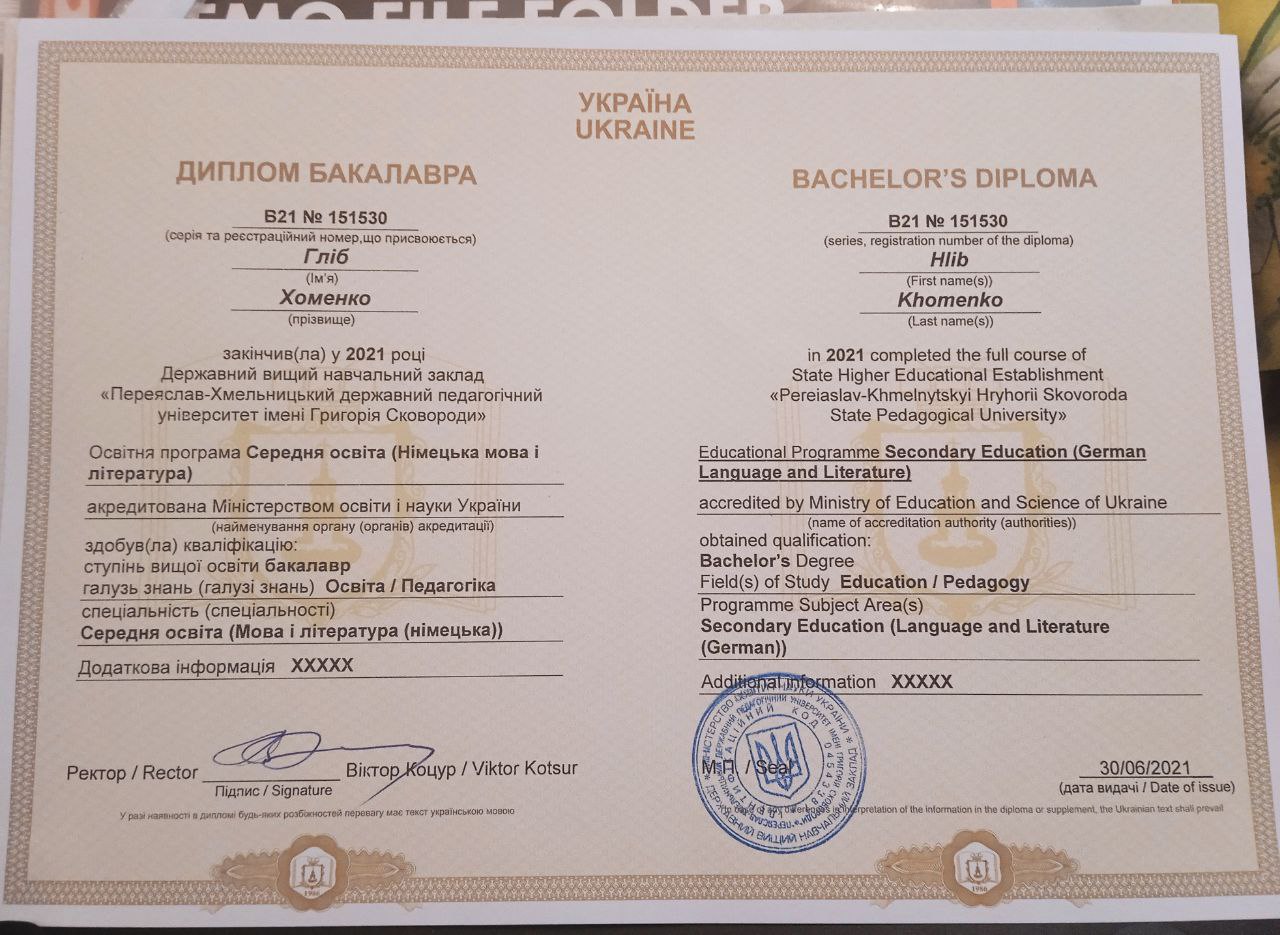 Закончил Переяслав-Хмельницкий государственный педагогический университет имени Григория Сковороды по специальности «Среднее образование (Язык и литература (немецкий))». Посещал курсы немецкого языка в Киевском национальном университете имени Тараса Шевченко, а также проходил обучение в Goethe-Institut. Преподаю немецкий язык уже более 8 лет. Имею опыт работы как в школах, так и в проведении индивидуальных занятий. Мои ученики становились призерами Всеукраинской ученической олимпиады, а также успешно сдавали экзамены, в том числе в Германии. Неоднократно посещал Германию, где посещал занятия в Mittelschule и Otfried-Preußler-Gymnasium, а также участвовал в учебных семинарах, во время которых немецкие коллеги делились своим опытом преподавания. Характерной чертой моей преподавательской деятельности является индивидуальный подход к каждому ученику. На уроках я обычно использую комплексный подход: ученики выполняют грамматические и лексические упражнения, тренируют навыки говорения. Мы изучаем именно то, что пригодится в повседневном общении, а не только теоретические аспекты языка. Пытаюсь делать занятия интересными и динамичными, применяя при этом современные и эффективные методы обучения. Кроме преподавательской деятельности, занимаюсь также переводами и веду собственный TikTok-канал, где мои видео набирают тысячи просмотров. Название канала: "Немецкий с Готлибом" https://www.tiktok.com/@gottliebua. Учю как детей, так и взрослых, в основном работаю с учениками от начального уровня до B1 включительно. Представленный график занятий — условный, обсуждаем его индивидуально, чтобы подобрать самое удобное время для каждого.