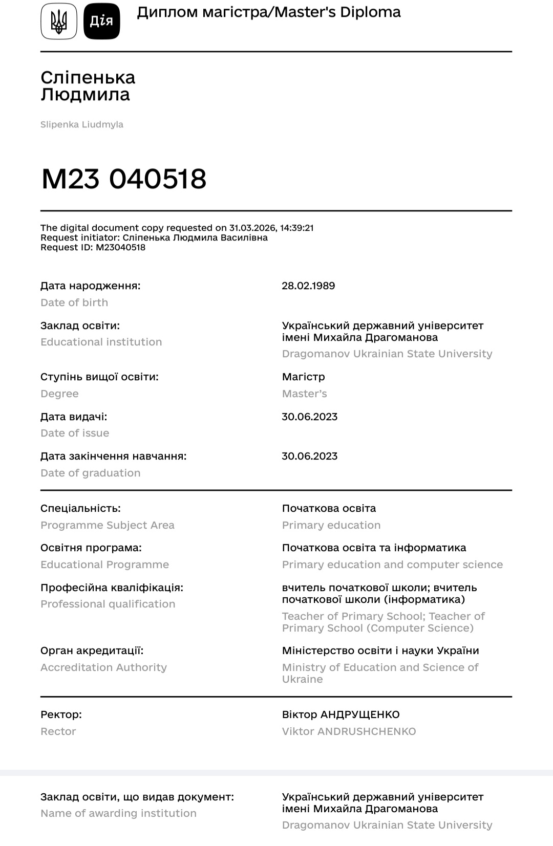 Я работаю учителем начальных классов в Международном лицее «Михаил» уже три года. До этого преподавала в государственной школе. Имею многолетний опыт обучения детей математике, украинскому языку и чтению.