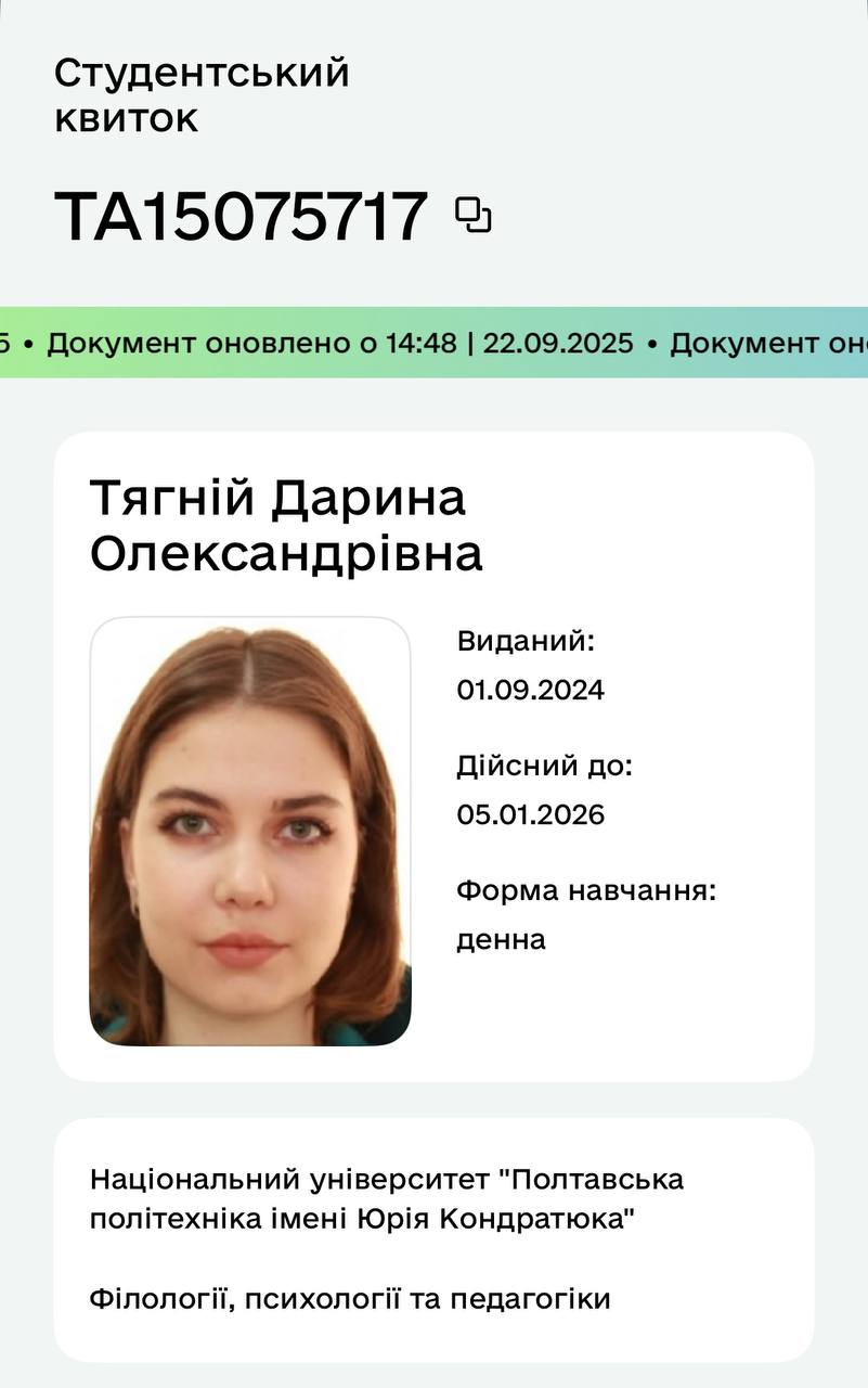 Я — Дарина Тягний, филолог-переводчик по образованию. Получила диплом бакалавра по специальности «Филология. Германские языки и литературы» и продолжаю обучение в магистратуре по специальности «Среднее образование (Английский язык и литература)». Такая комбинация позволяет мне сочетать глубокие знания языка с профессиональными педагогическими навыками.