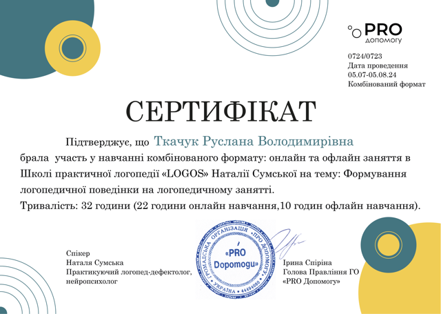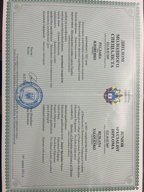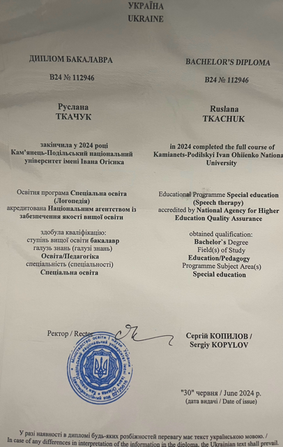 Училась 4 года в Хмельницкой гуманитарно-педагогической академии, потом еще почти 3 года в Каменец-Подольском национальном университете. Работаю с детьми с 18 лет, люблю помогать детям получать желаемый результат. На данный момент я мама, и моя доченька еще больше расширила представление о детском развитии и еще больше замотивировала на работу с нашими чудесными детьми.