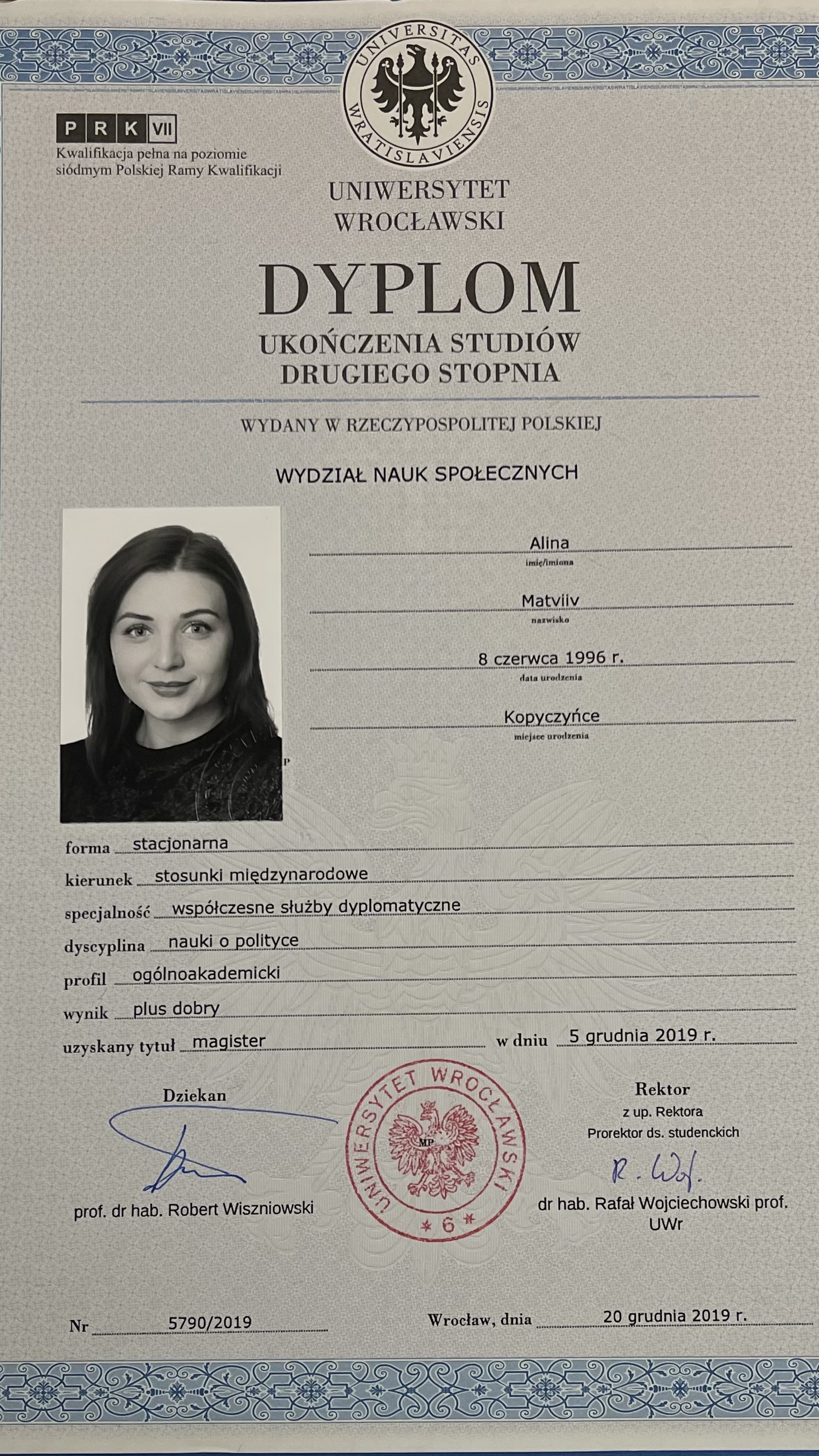 Моя образовательная база была сформирована в одном из ведущих европейских центров – я получила степень магистра по международным отношениям в престижном Вроцлавском университете (Uniwersytet Wrocławski, Польша). Так что, как учат в Польши - польским языком, я точно знаю.