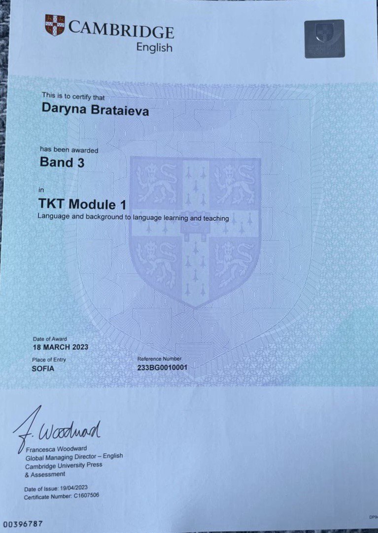 Я Дарина, преподаватель английского с 5-летним опытом и сертификатом TKT.