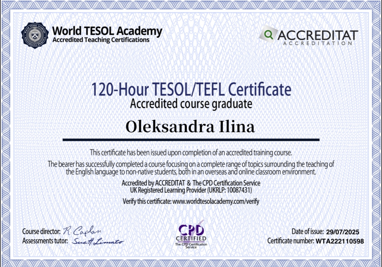 - Имею сертификат TEFL/TESOL - документ международного образца, который подтверждает высокий уровень знаний и владения английским языком, а также наличие навыков и знаний для преподавания английского языка для детей, подростков и взрослых.