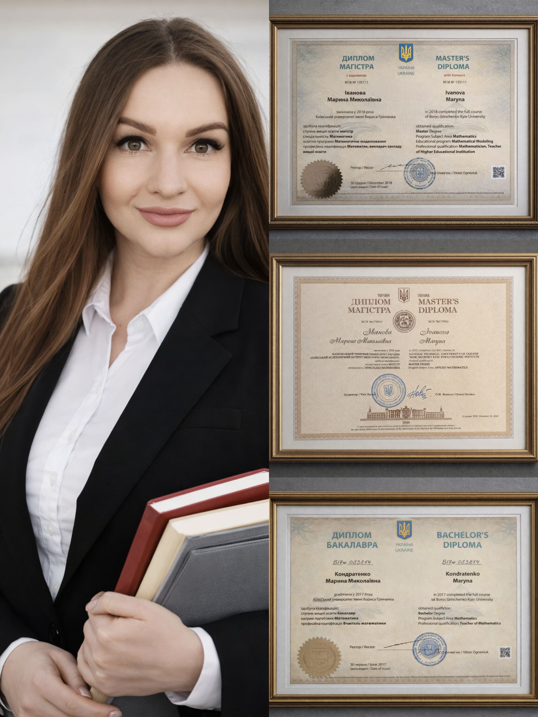 У меня два высших математических образования и более 12 лет успешного преподавания. За это время я помогла десяткам учеников существенно повысить уровень знаний, сдать экзамены на высокие баллы и поверить в собственные силы. У меня большое количество положительных отзывов и стабильные результаты учеников. Работаю системно, требовательно и на результат — без "воды" и бесполезного заучивания. Если нужен реальный прогресс в математике, вы по правильному адресу.