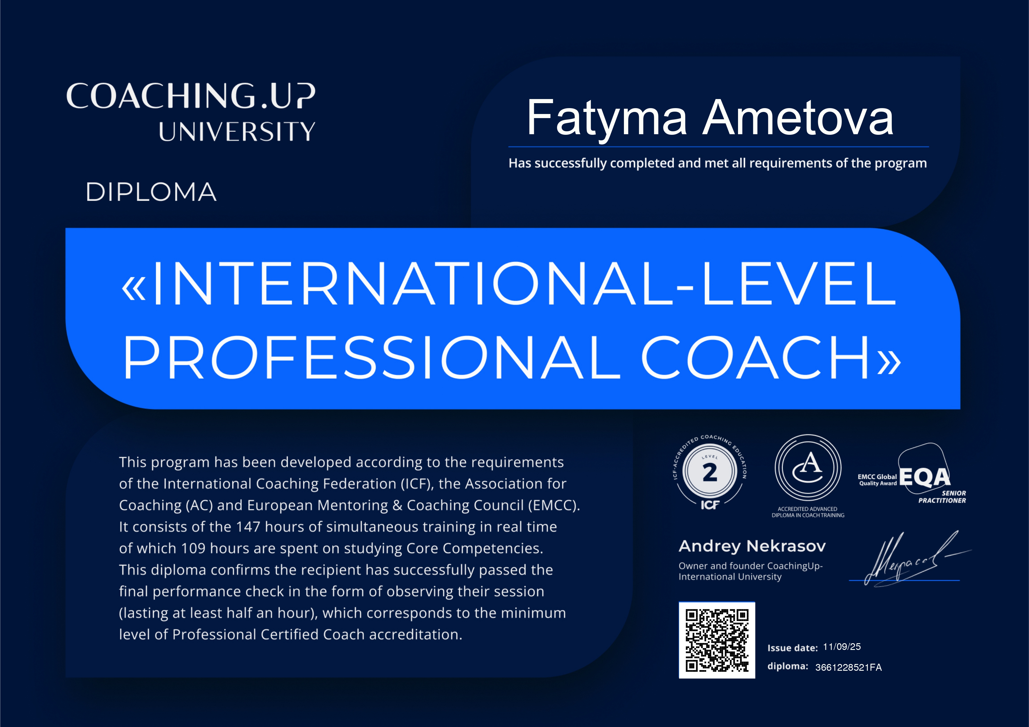 Я являюсь стратегическим консультантом по подготовке к IELTS, с которым вы четко пропишите и достигнете своей цели в период от 6 дней до 6 месяцев. У меня есть сертификат коуча по международным стандартам ICF и я использую коучинговые инструменты в работе с клиентами, что помогает достигать лучших результатов.