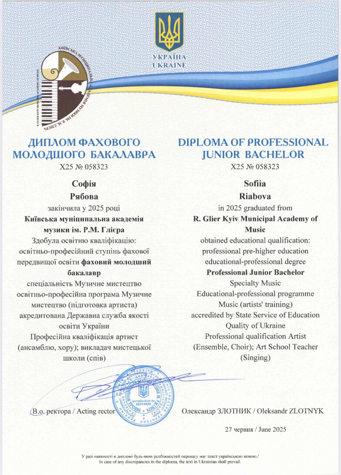 Я — дипломированный квалифицированный младший бакалавр музыкального искусства. Мои официальные квалификации: "Преподаватель художественной школы (Вокал)" и "Артист ансамбля/хора".
