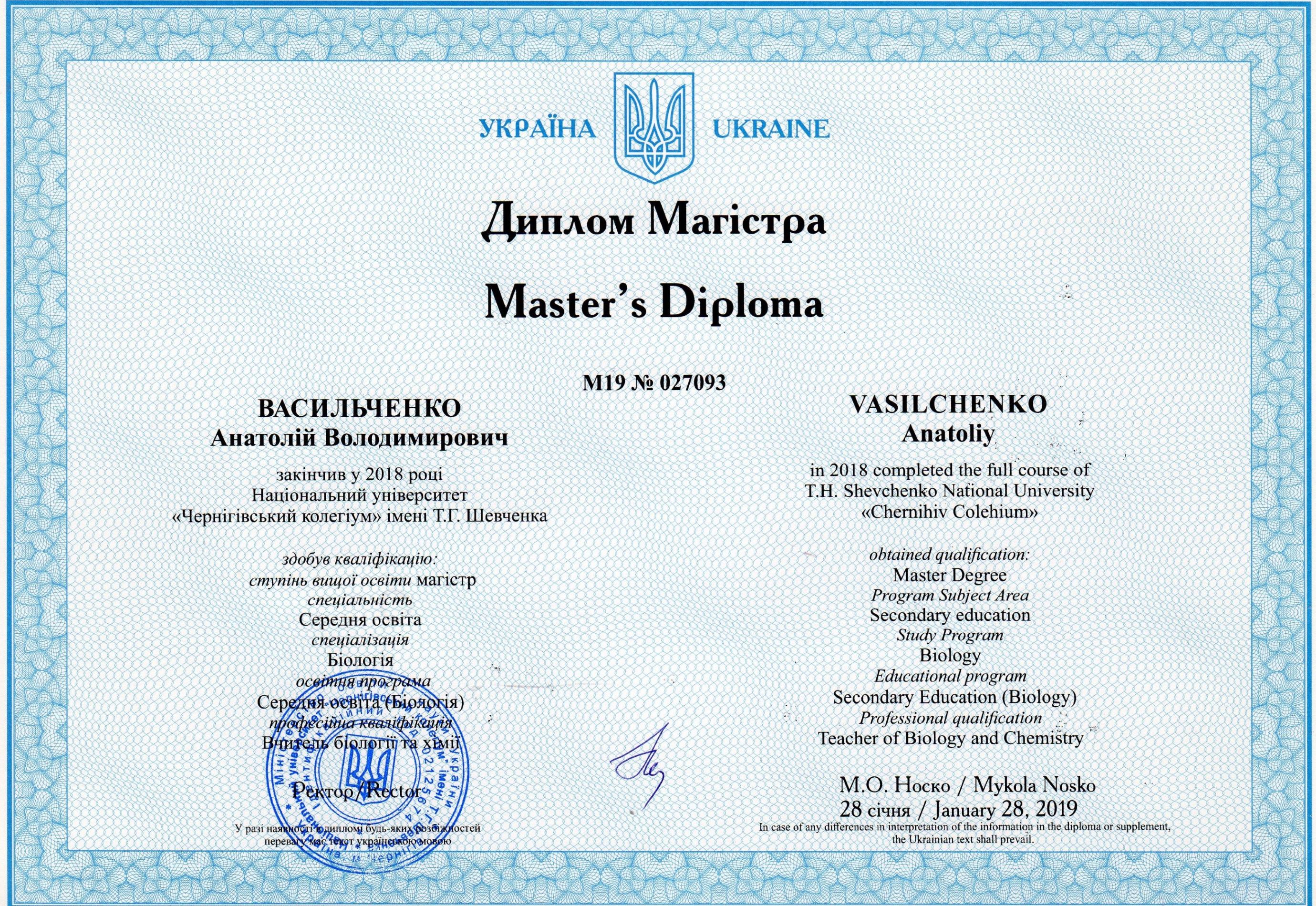 В 2018 году закончил обучение в Национальном университете "Черниговский коллегиум" и получил профессиональную квалификацию учителя биологии и химии. Также имею еще два высших образования в областях биологии и агрономии. На протяжении 2,5 лет работал в Малой академии Украины. Под моим руководством ученики занимали призовые места на Всеукраинском этапе конкурса-защиты ученических научных работ.