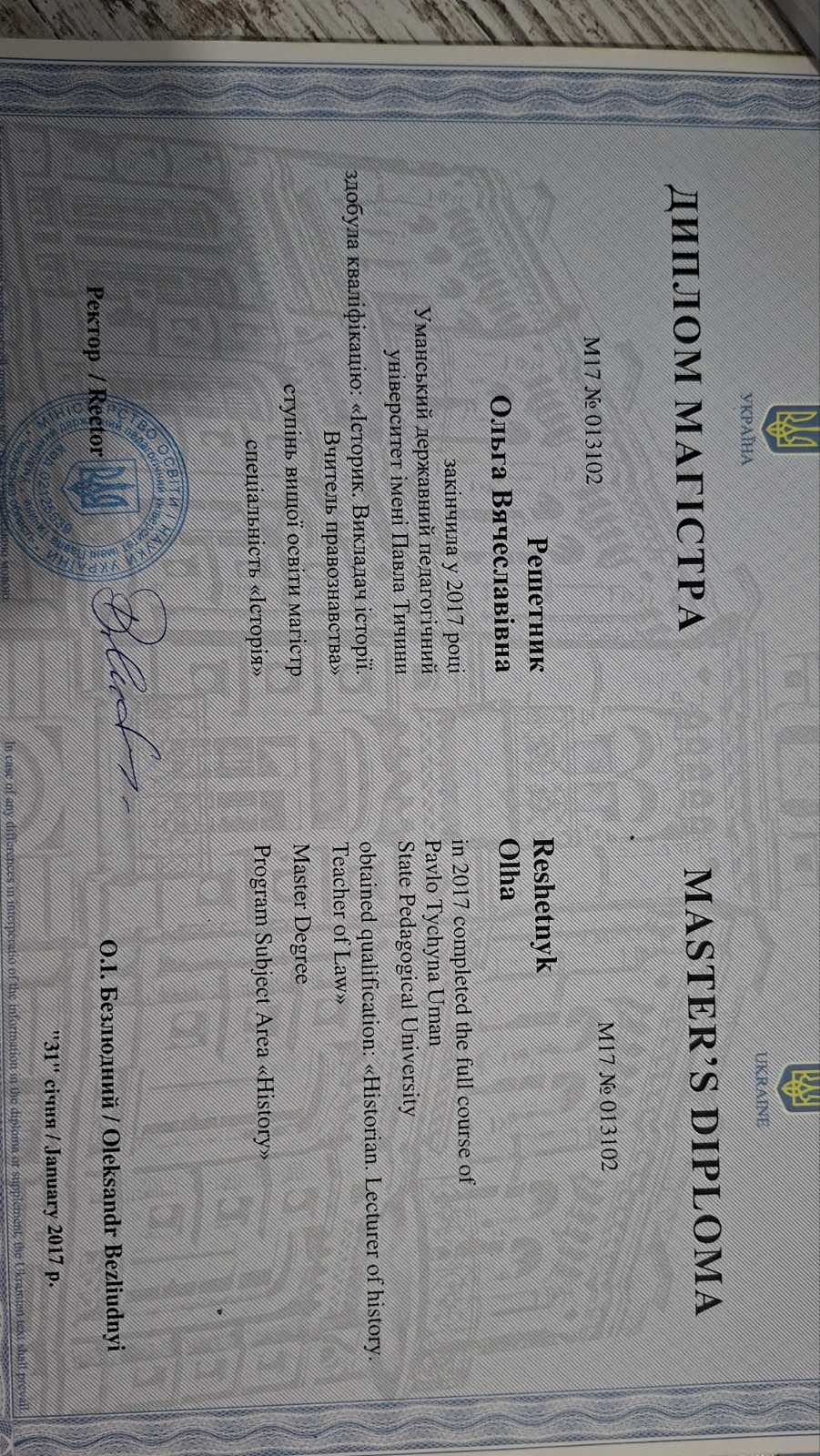 У меня степень магистра истории Уманского государственного педагогического университета им. П.Тычины. Я специализируюсь на подготовке учеников к ЗНО/НМТ/ДПА/компенсации образовательных потерь, помощи с домашними заданиями по истории.