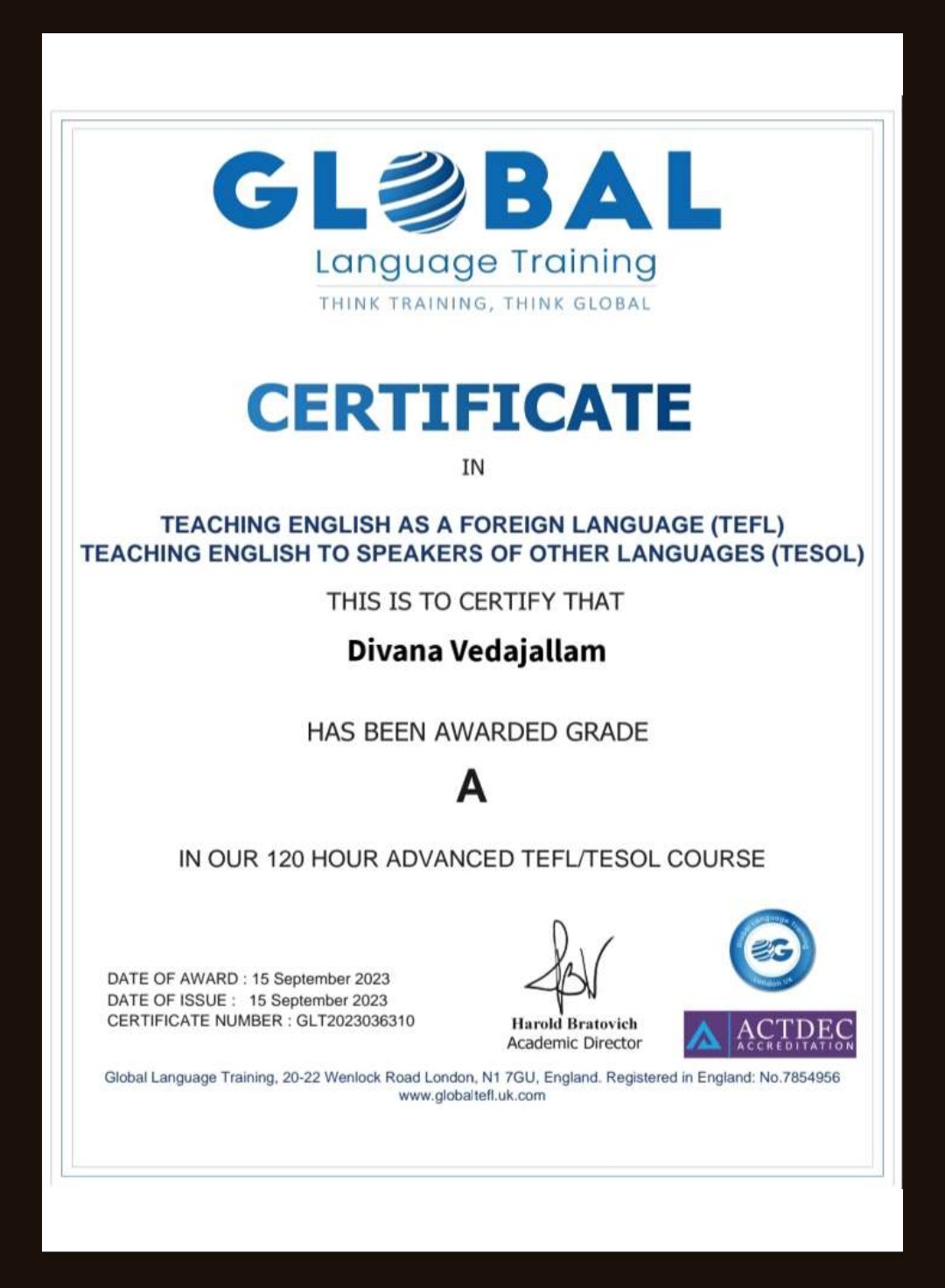 Привет! Меня зовут Диван. Я сертифицированный преподаватель английского (TOEFL, ESL) с 7-летним опытом, работала со студентами из более чем 10 стран. Ко мне часто приходят ученики, которые уже учили английский, но не могут говорить уверенно. Они говорят: "Я учу, но результата нет." Моя цель – изменить это и помочь вам заговорить естественно и легко.