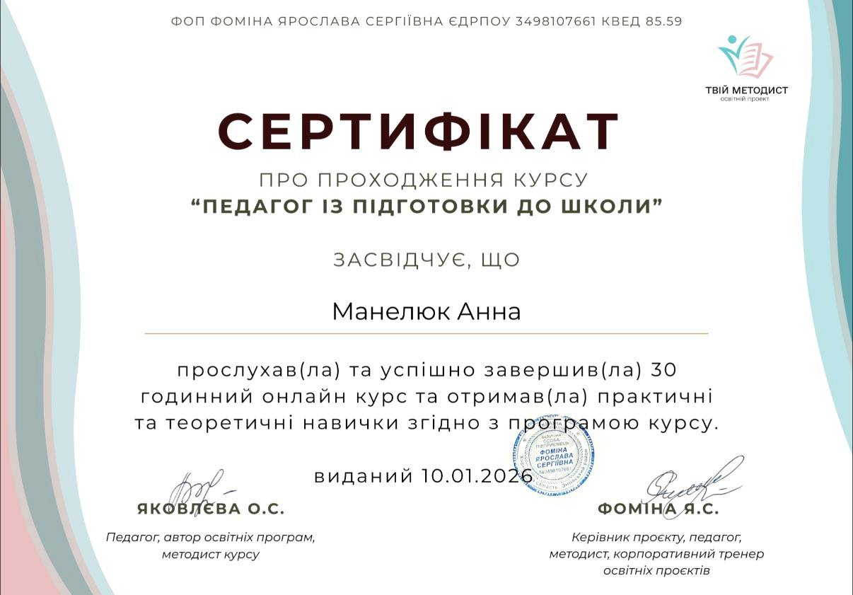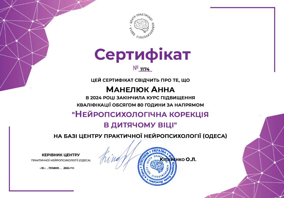 Я – студентка НПУ имени М. П. Драгоманова. Мое преимущество – сочетание современной академической подготовки с практическим опытом и работой в нейропсихологическом подходе, что позволяет комплексно оценивать готовность ребенка к школе и строить индивидуальные программы развития.