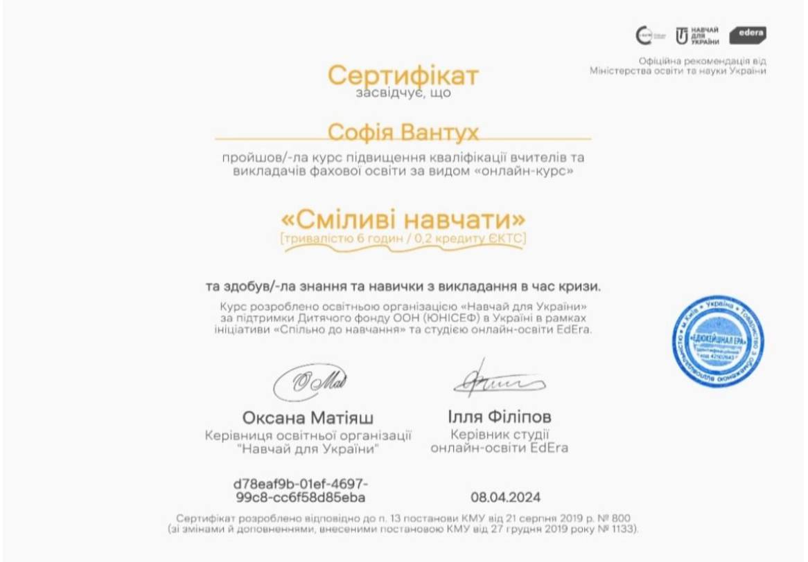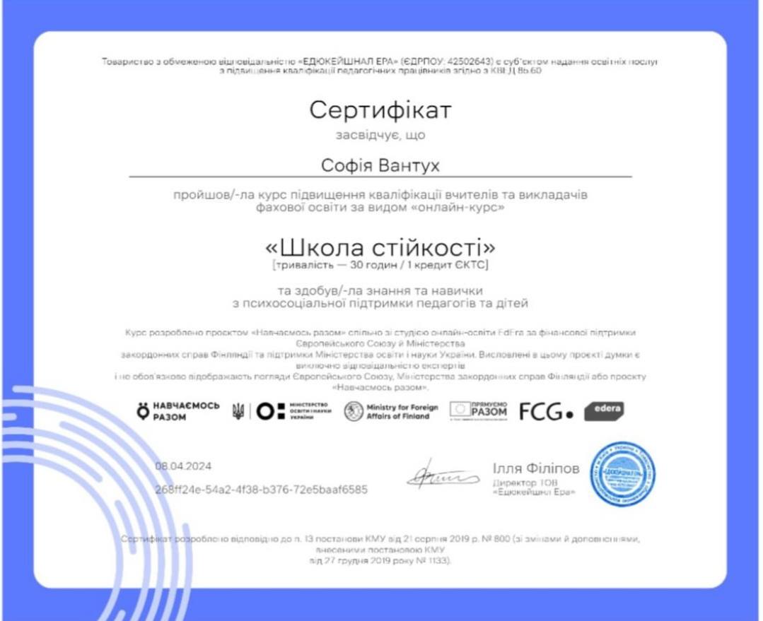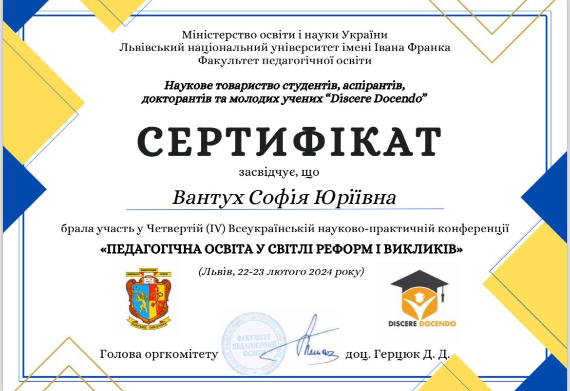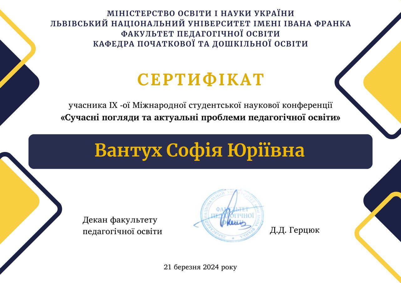 Закончила ЛНУ имени Ивана Франко, факультет педагогического образования с отличием. Стараюсь не только научить, но и влюбить в предмет. Умею находить подход к разным детям, придерживаюсь принципов педагогики партнерства. Любимый принцип обучения - связь с жизнью. Стараюсь дать каждому ученику возможность почувствовать себя победителем.