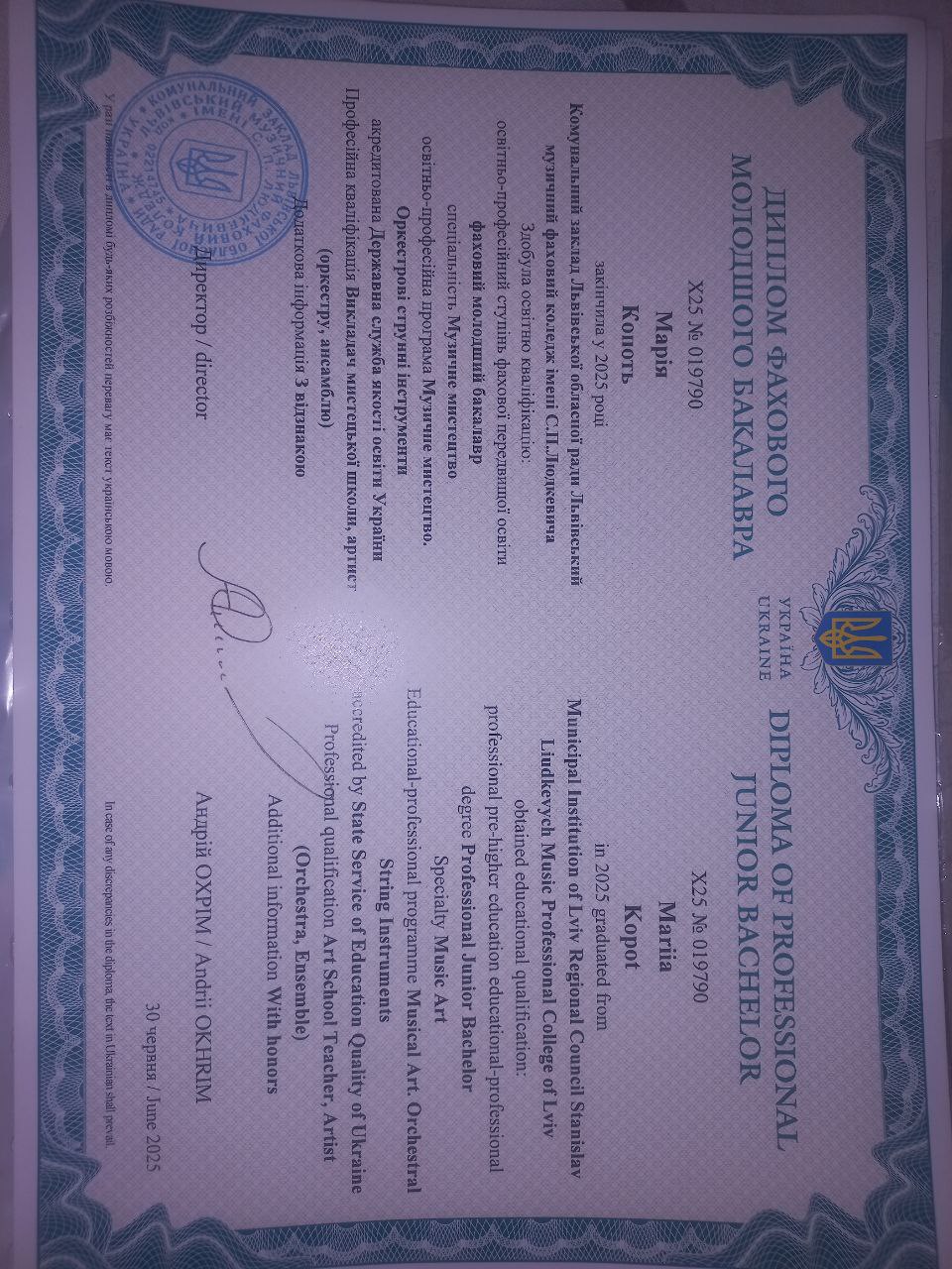 Музыка была интересна для меня ещё с малых лет, а мои первые занятия на скрипке начались в 6 лет. После окончания музыкальной школы я поступила в Львовский музыкальный профессиональный колледж имени С. Людкевича. Во время учебы имела опыт преподавания уроков по скрипке в студии педагогической практики. С 2025 года обучаюсь во Львовской национальной музыкальной академии имени М. Лысенко. Также имею опыт работы со студенческим любительским оркестром.