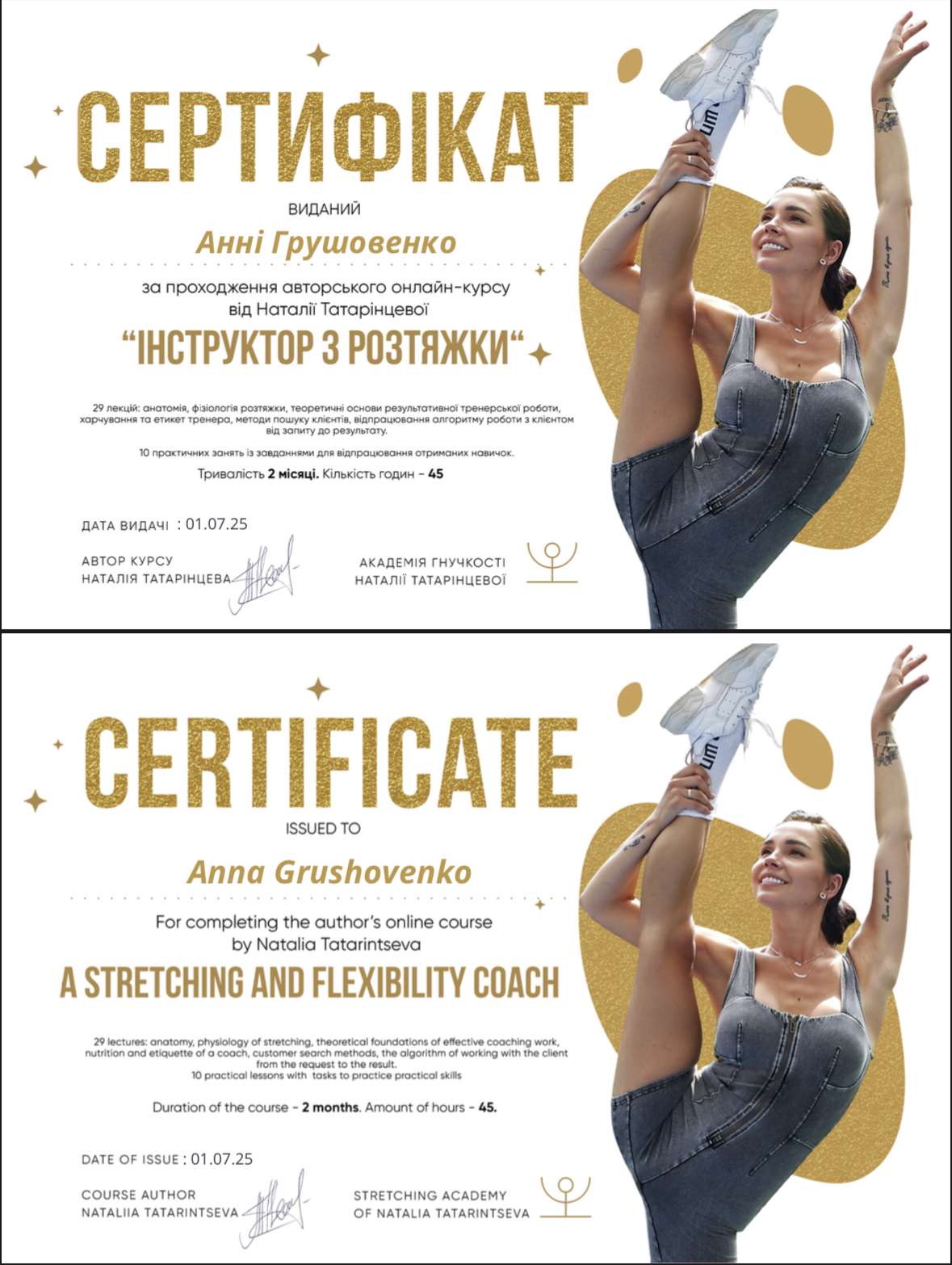 Работаю тренером и инструктором йоги, стретчинга и фитнеса. Использую сочетание силовых, функциональных и мобилизационных упражнений. Учебный процесс строю индивидуально, с учетом уровня подготовки, целей и состояния тела. Объясняю технику выполнения и принципы движения. Учащиеся улучшают силу, гибкость, координацию и общее самочувствие. Сажу на шпагат без боли и слез, помогаю избавиться от болей в спине, скованности в теле, выравниваю осанку. При составлении индивидуального плана тренировок бонусом добавляю рекомендации по правильному питанию, чтобы клиенту было легче достичь поставленной цели. Работаю с людьми с любым уровнем подготовки, любым весом и особенностями тела.