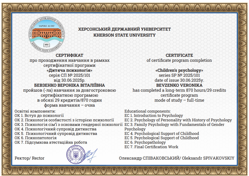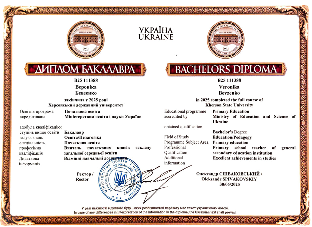 Я дипломированный учитель начальных классов, закончила ХДУ по специальности "Начальное образование". Имею опыт работы с детьми дошкольного и младшего школьного возраста, провожу индивидуальные занятия по подготовке к школе и репетиторству. Использую современные игровые и интерактивные методики, подбираю программу в соответствии с потребностями, интересами и уровнем знаний каждого ребенка.