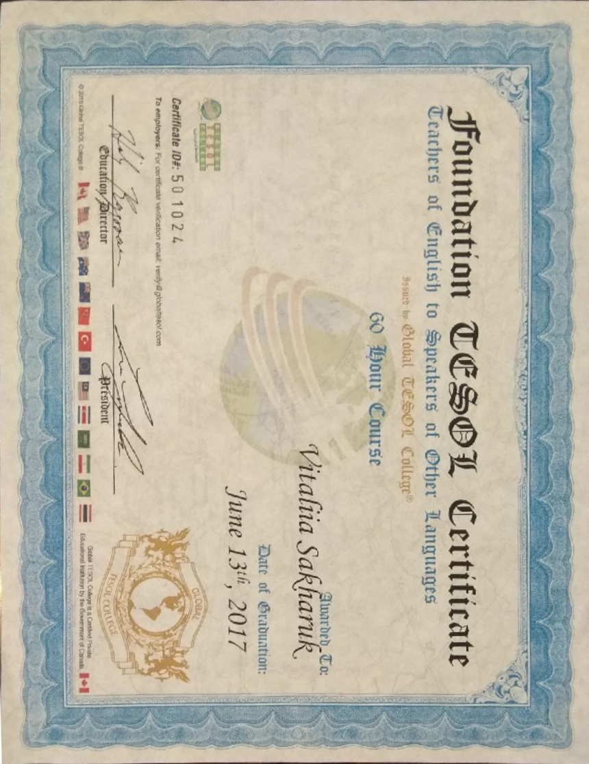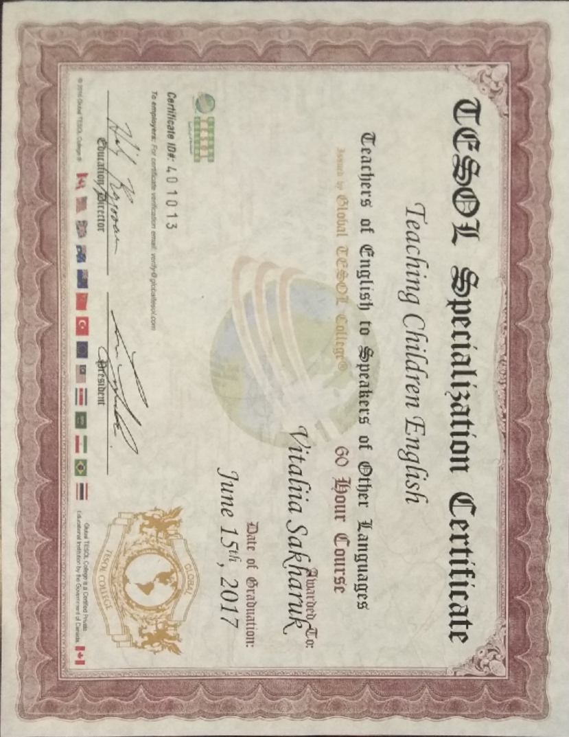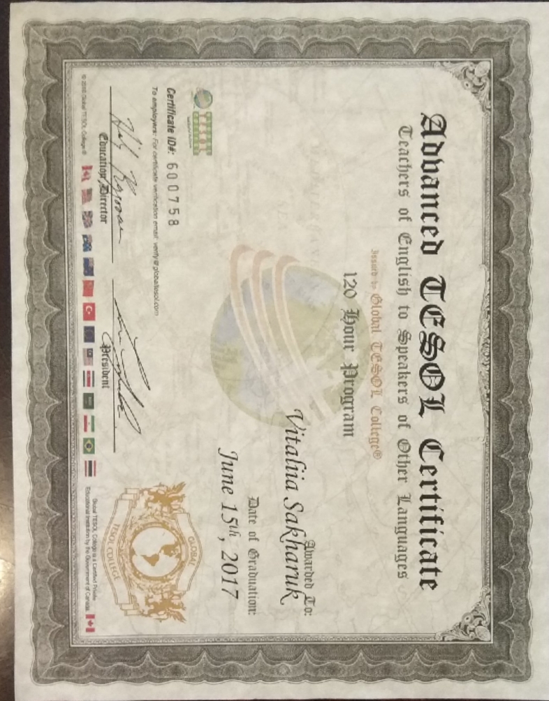 * Профессиональное образование в Украине и сертификация TESOL (Канада).